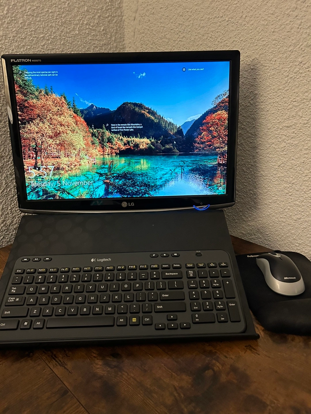 Desktop computer with monitor, keyboard, mouse, foot rest, and assorted accessories. Includes a DVD drive and a card reader. Good for a primary grade student.