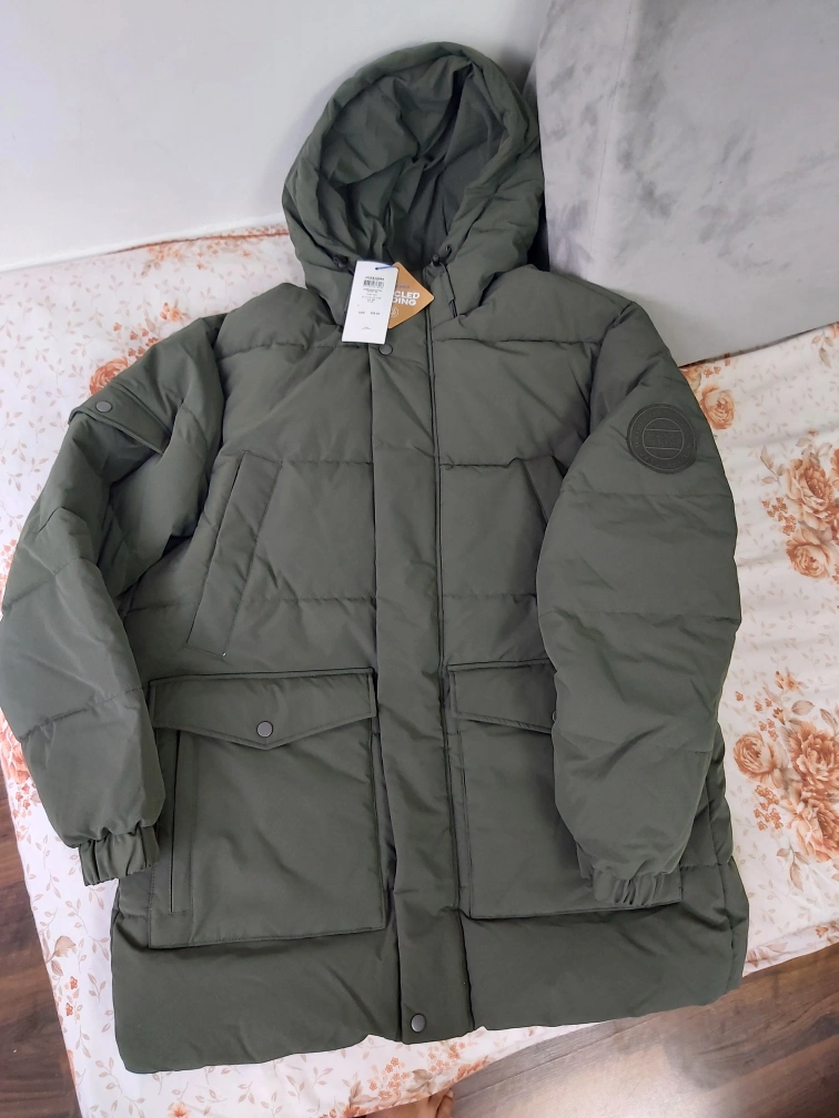 Brand new Jack and Jones green puffer jacket with a hood and multiple pockets.
