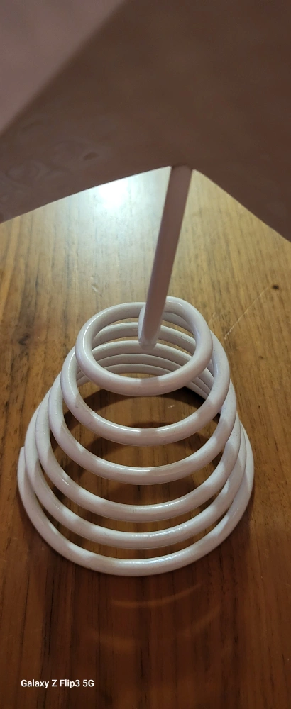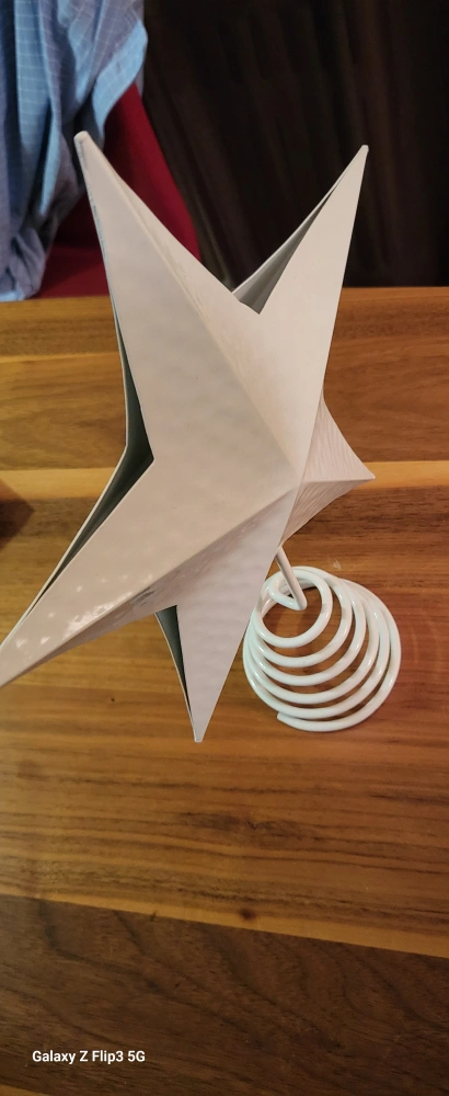 White metal Christmas tree topper with a star shape. It has a sturdy spring base to hold position.