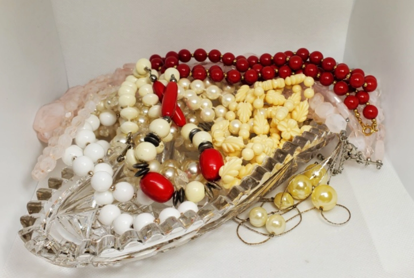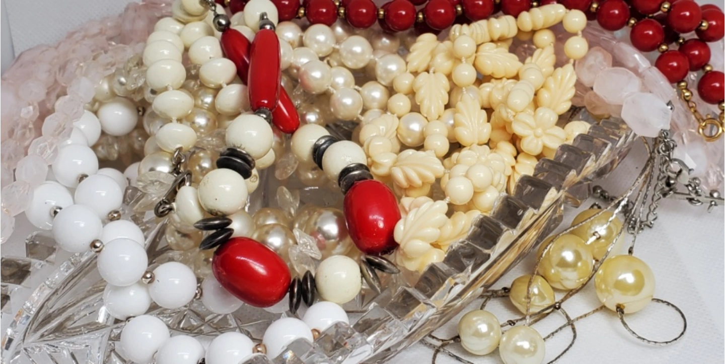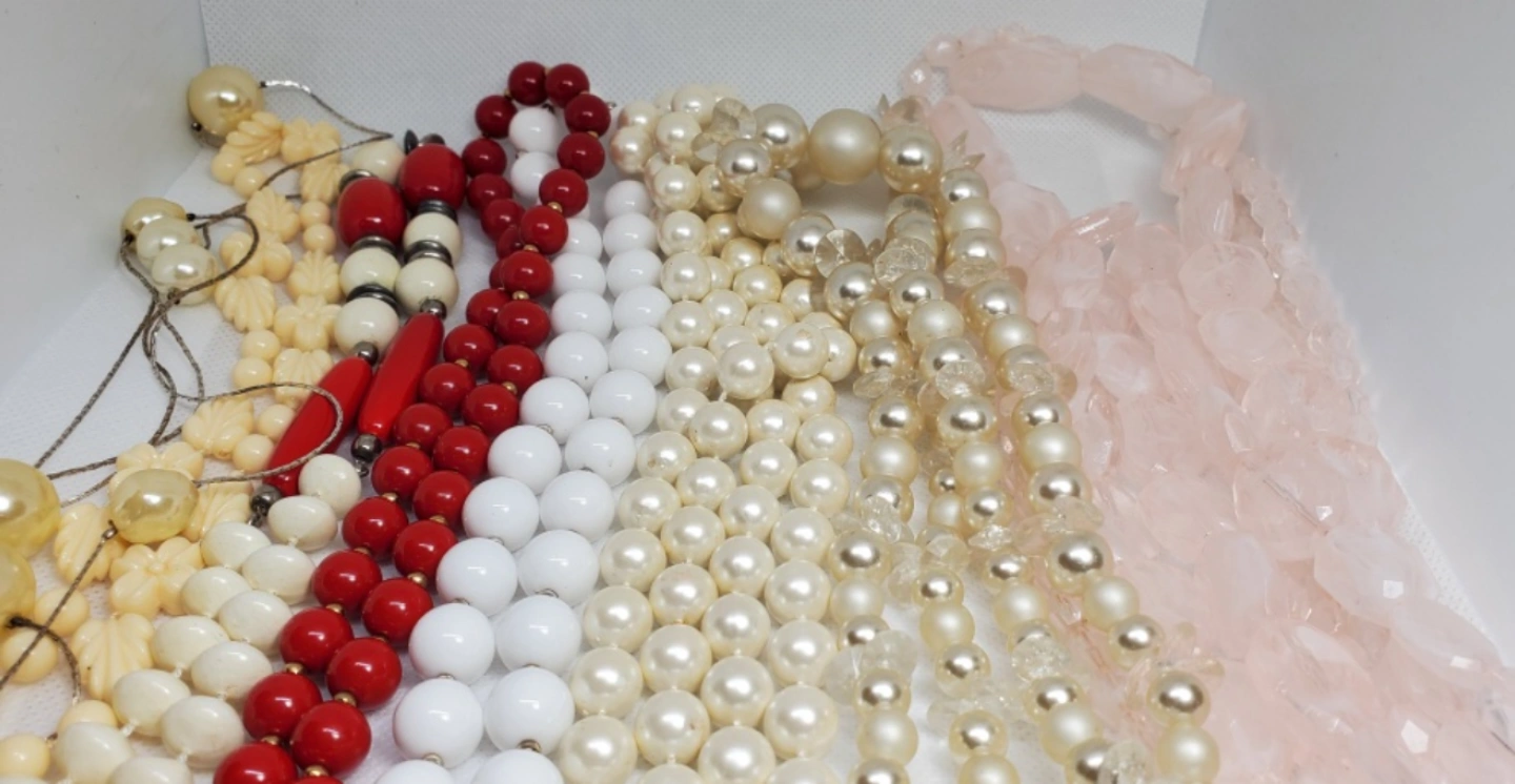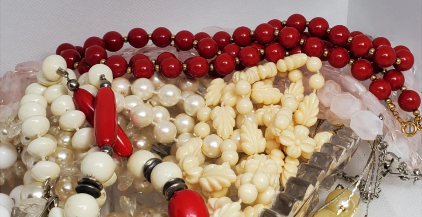 A lot of vintage beaded necklaces. Includes red, white, and pink necklaces. They are made of hiqh quality plastic materials. some are bakelite plastic.