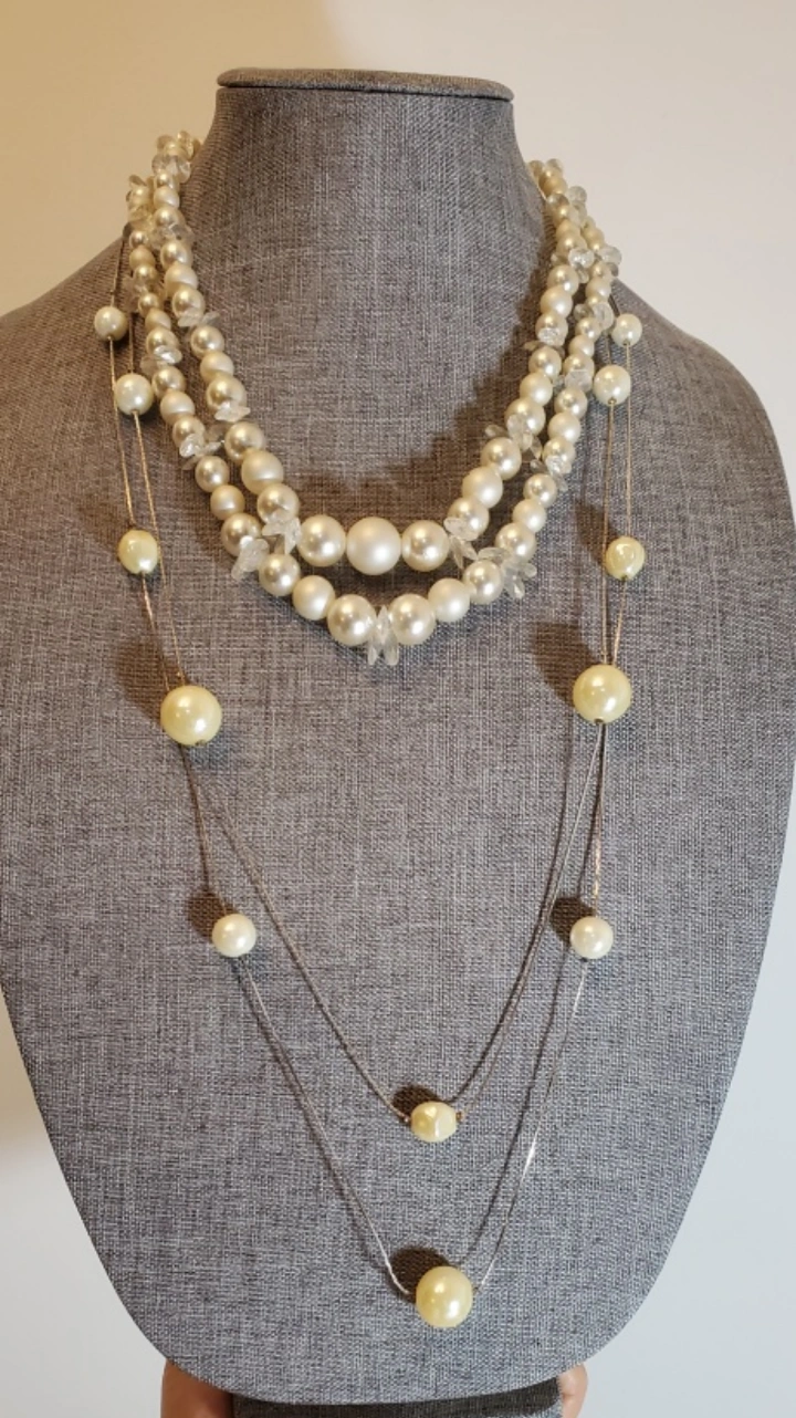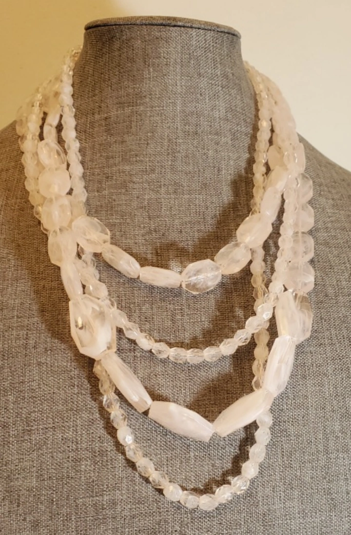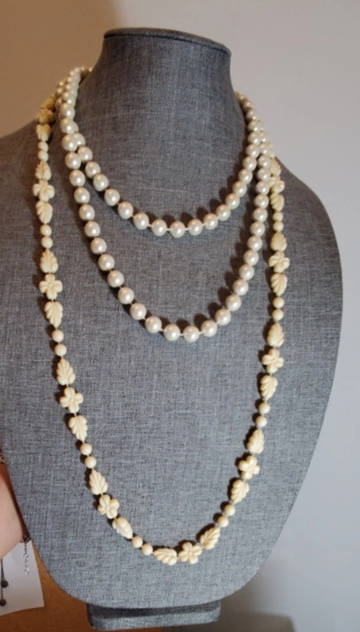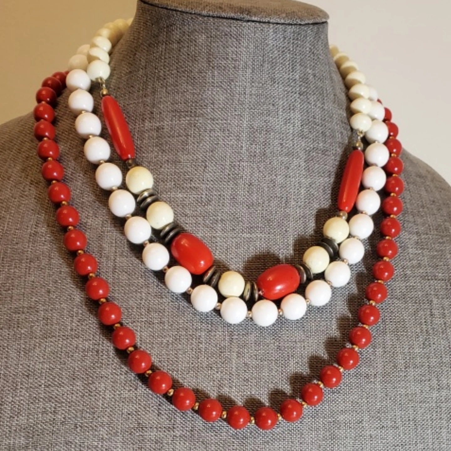 A lot of vintage beaded necklaces. Includes red, white, and pink necklaces. They are made of hiqh quality plastic materials. some are bakelite plastic.