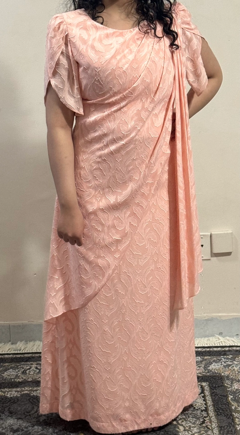 Pink embroidered dress with short sleeves, an asymmetric neckline, and a long flowing skirt.