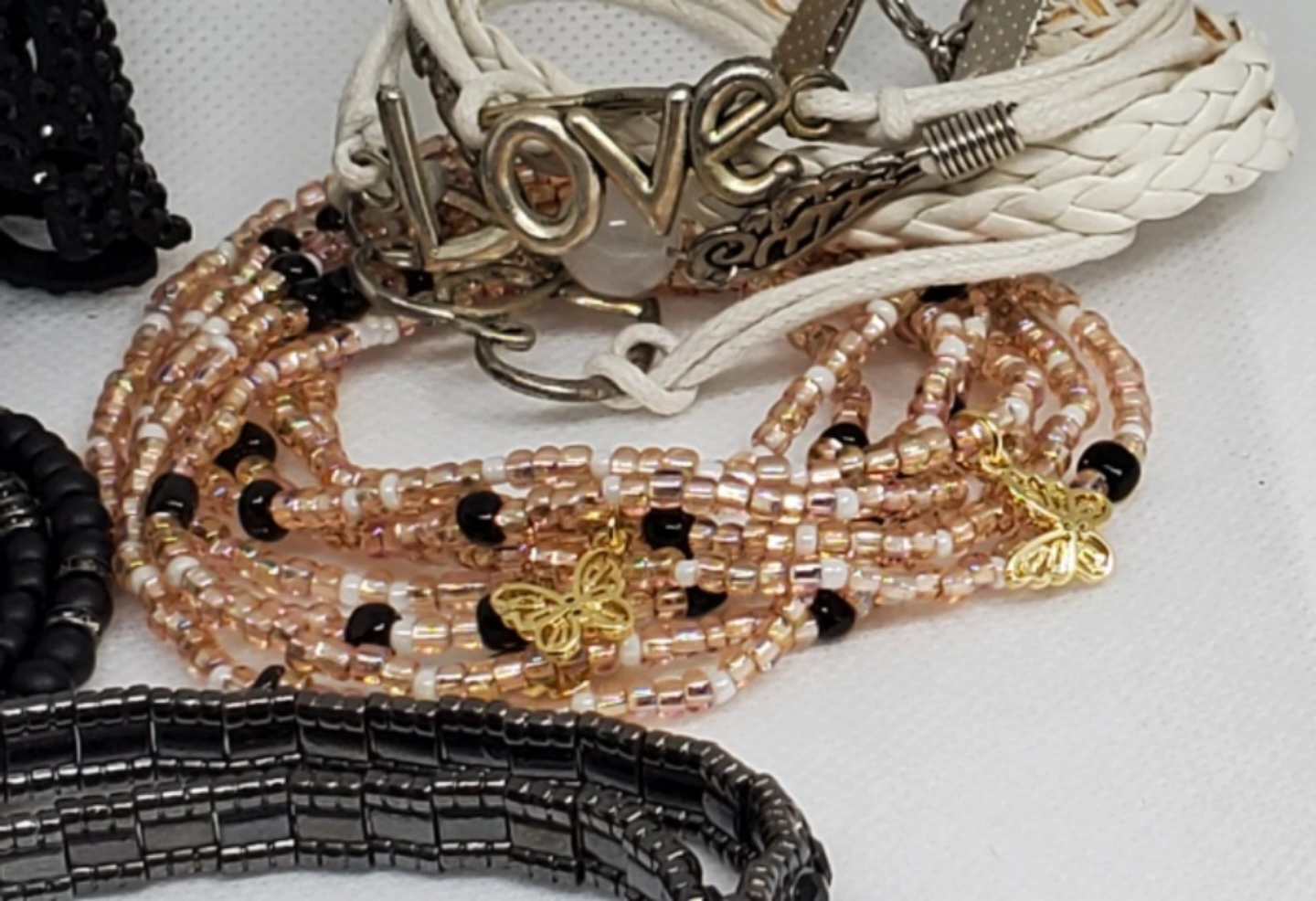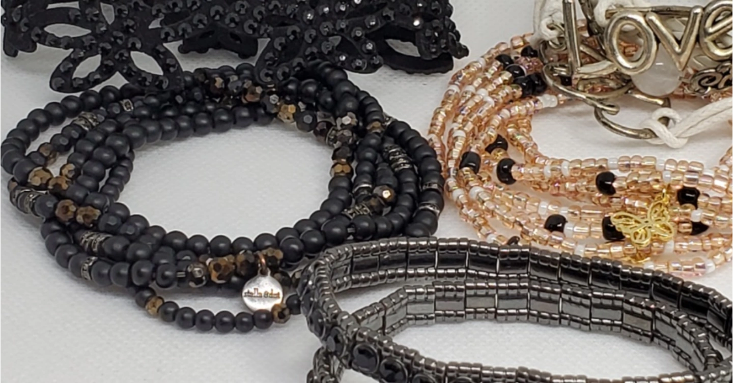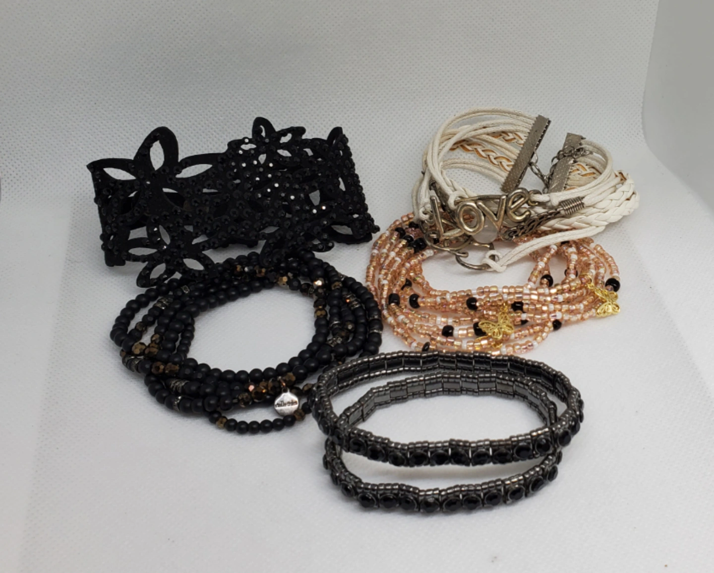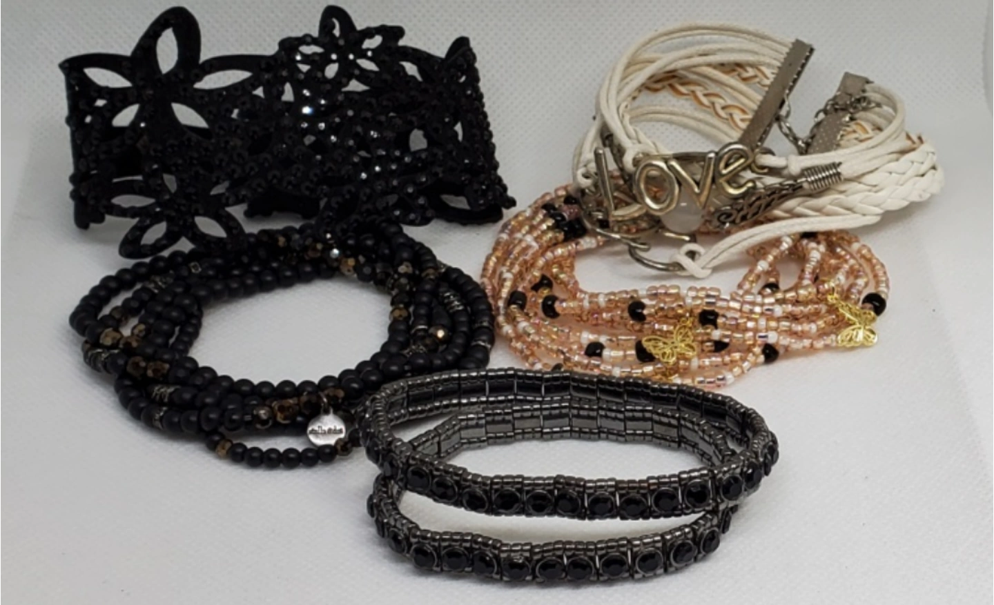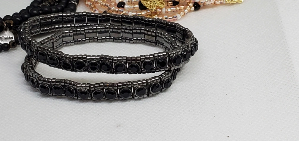 Set of 5 beaded bracelets. The bracelets are all black with some gold accents. They are made of different materials, including beads, leather, and metal. The bracelets are all in good condition.