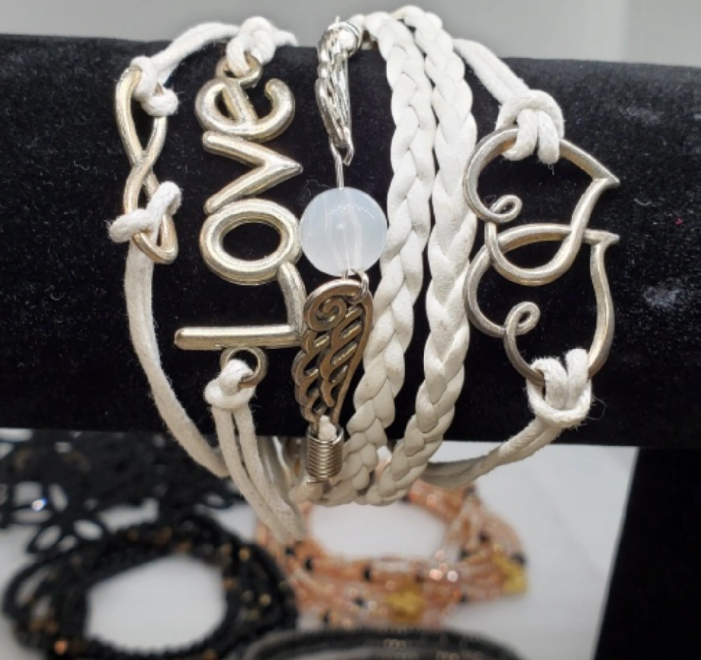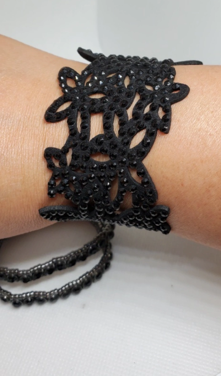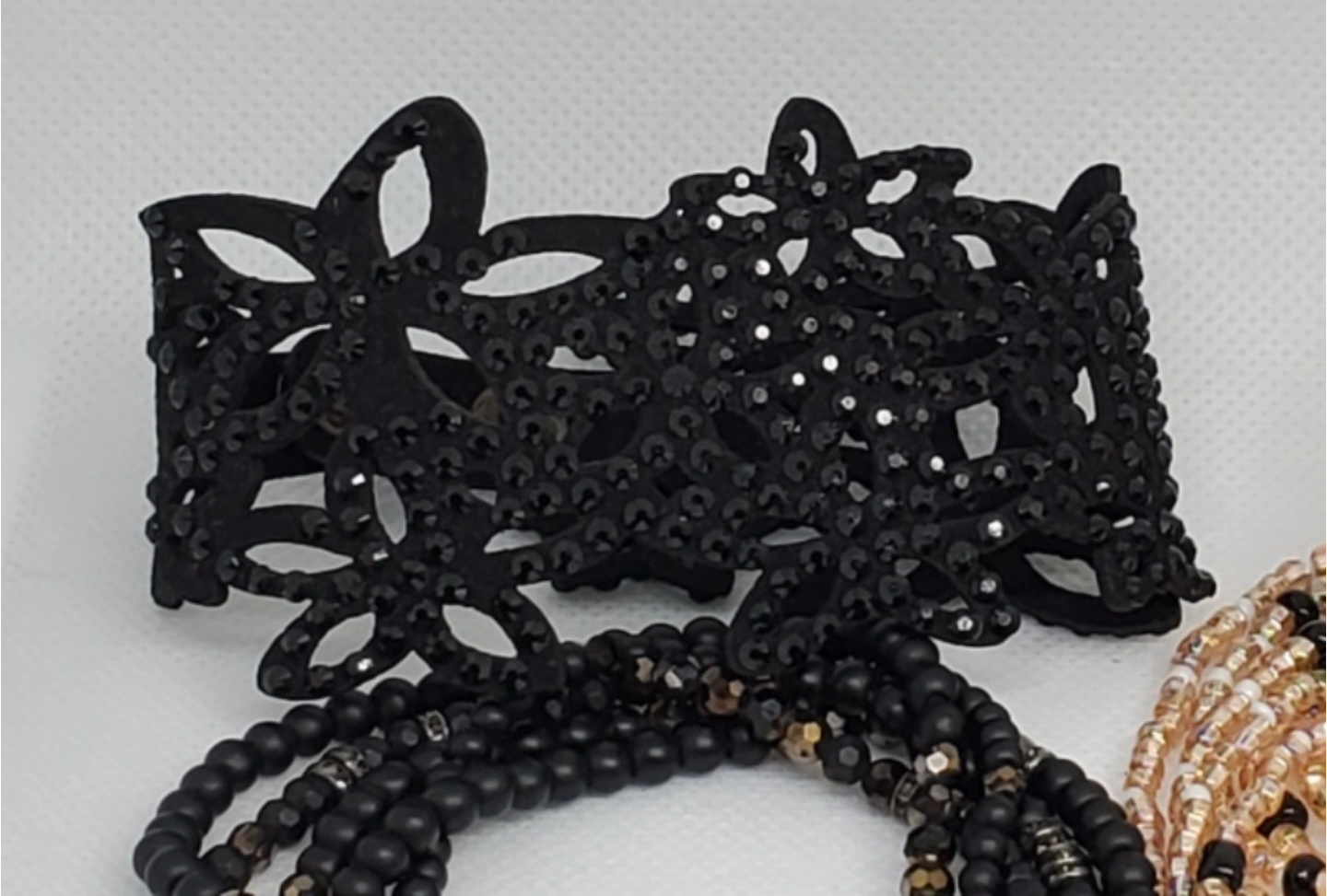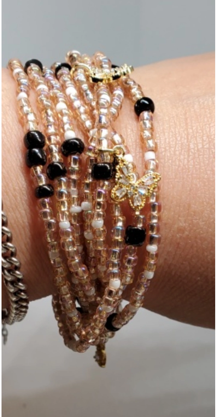 Set of 5 beaded bracelets. The bracelets are all black with some gold accents. They are made of different materials, including beads, leather, and metal. The bracelets are all in good condition.