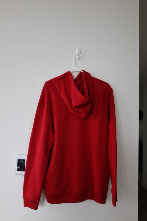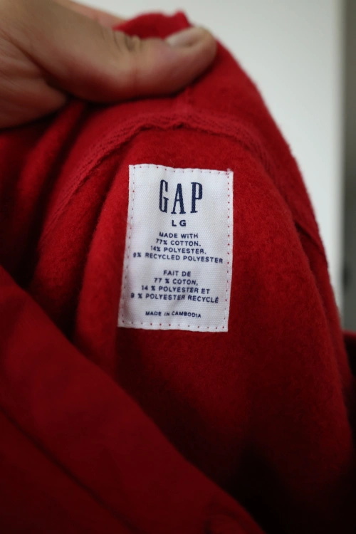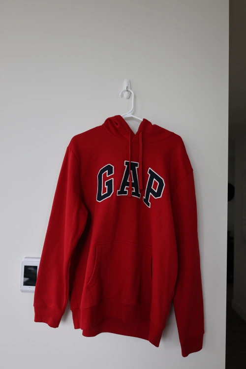 Red hoodie with a large Gap logo on the front. Size: Large. Made in Cambodia. 77% cotton, 14% polyester, 9% recycled polyester.