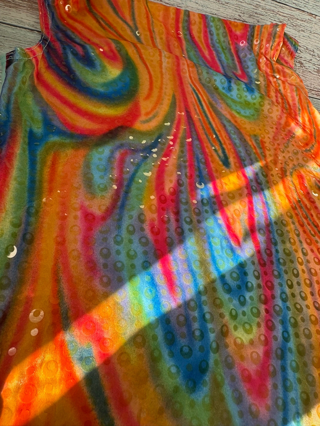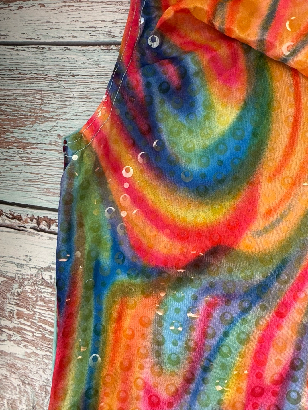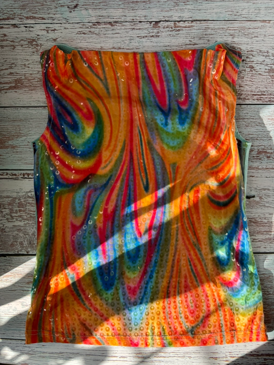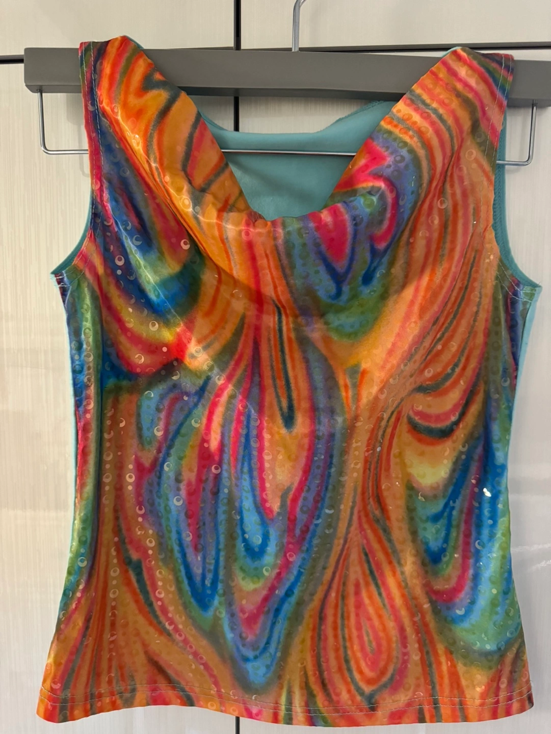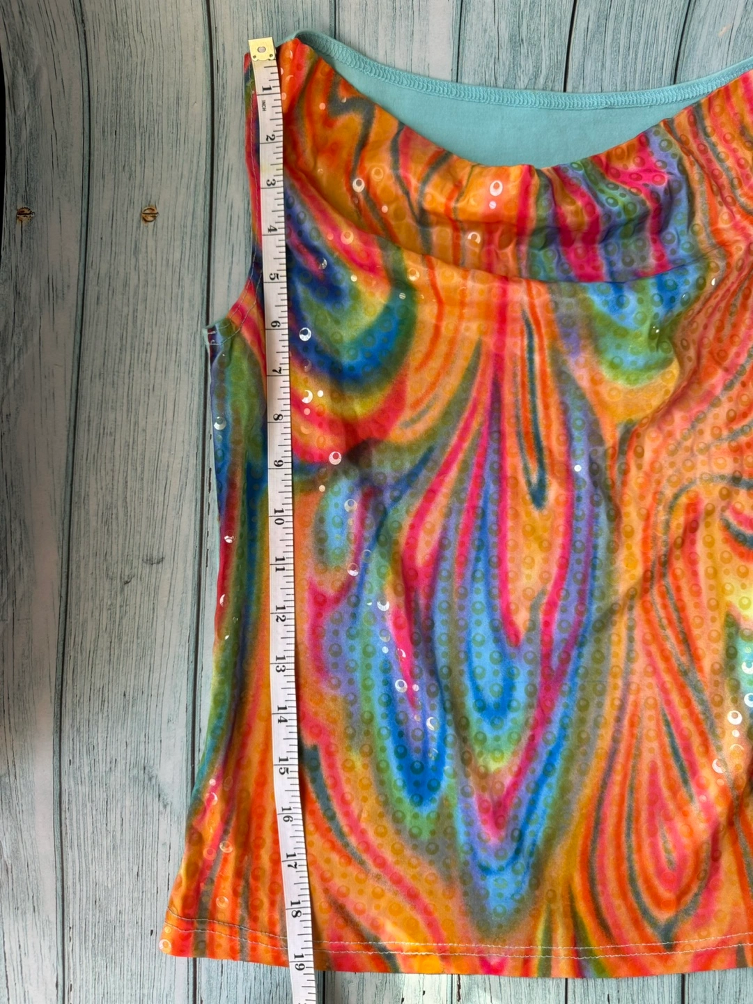 94Sleeveless tank top with a cowl neckline. Made of a sequined fabric. Features a rainbow swirl pattern.