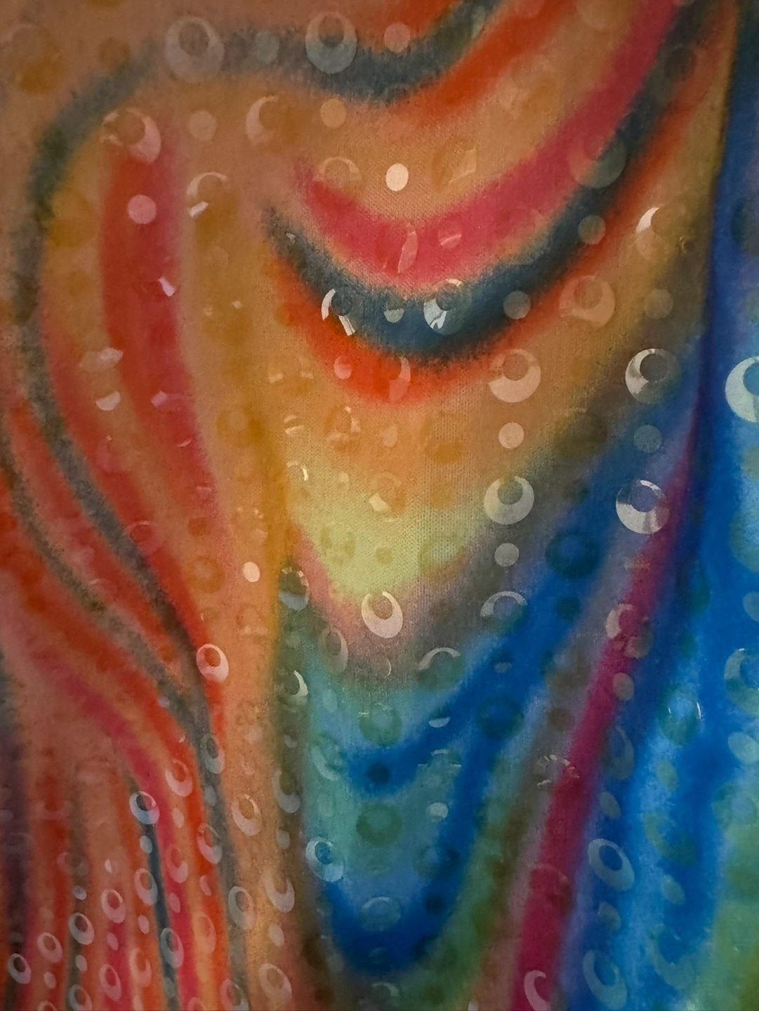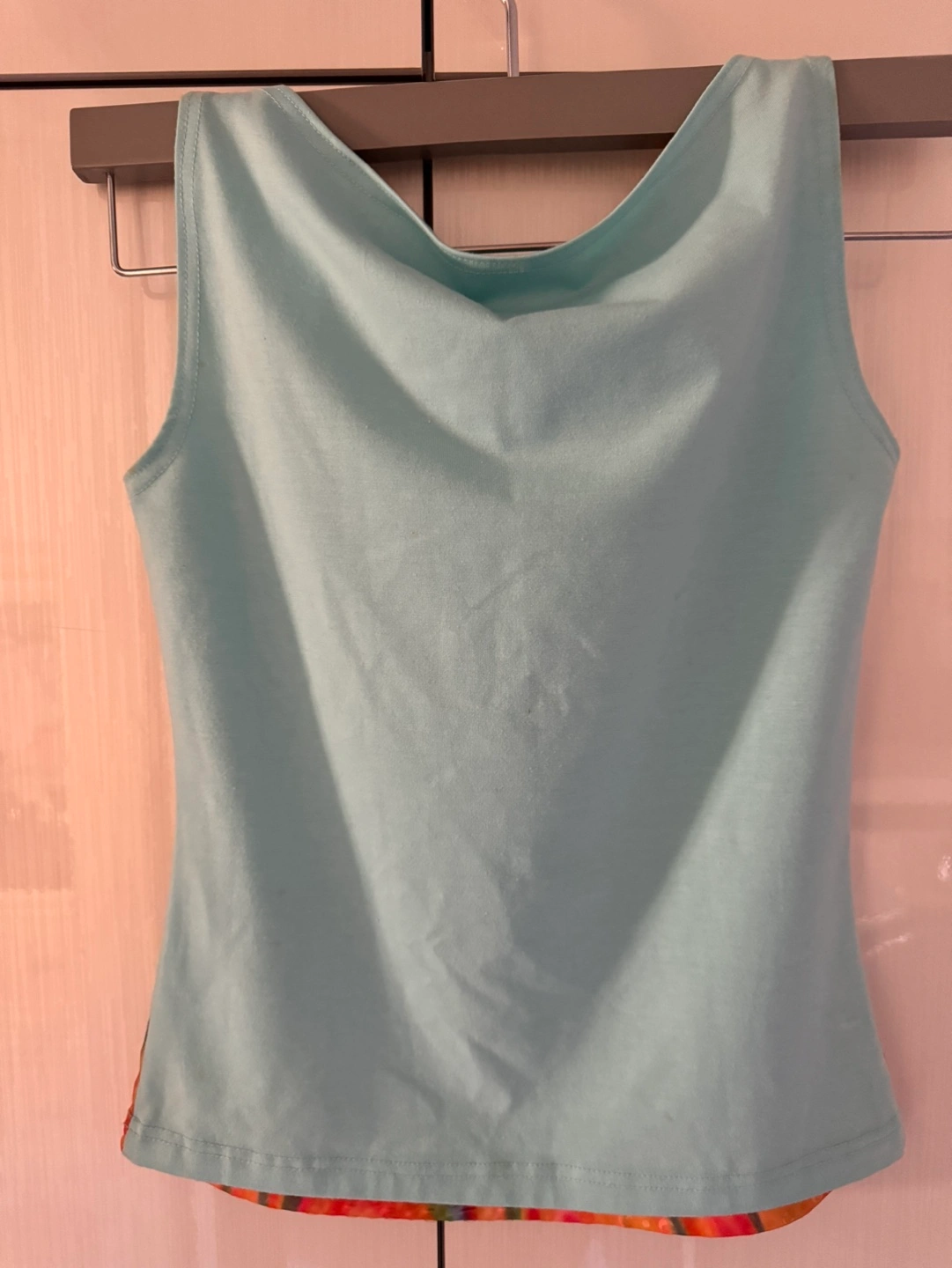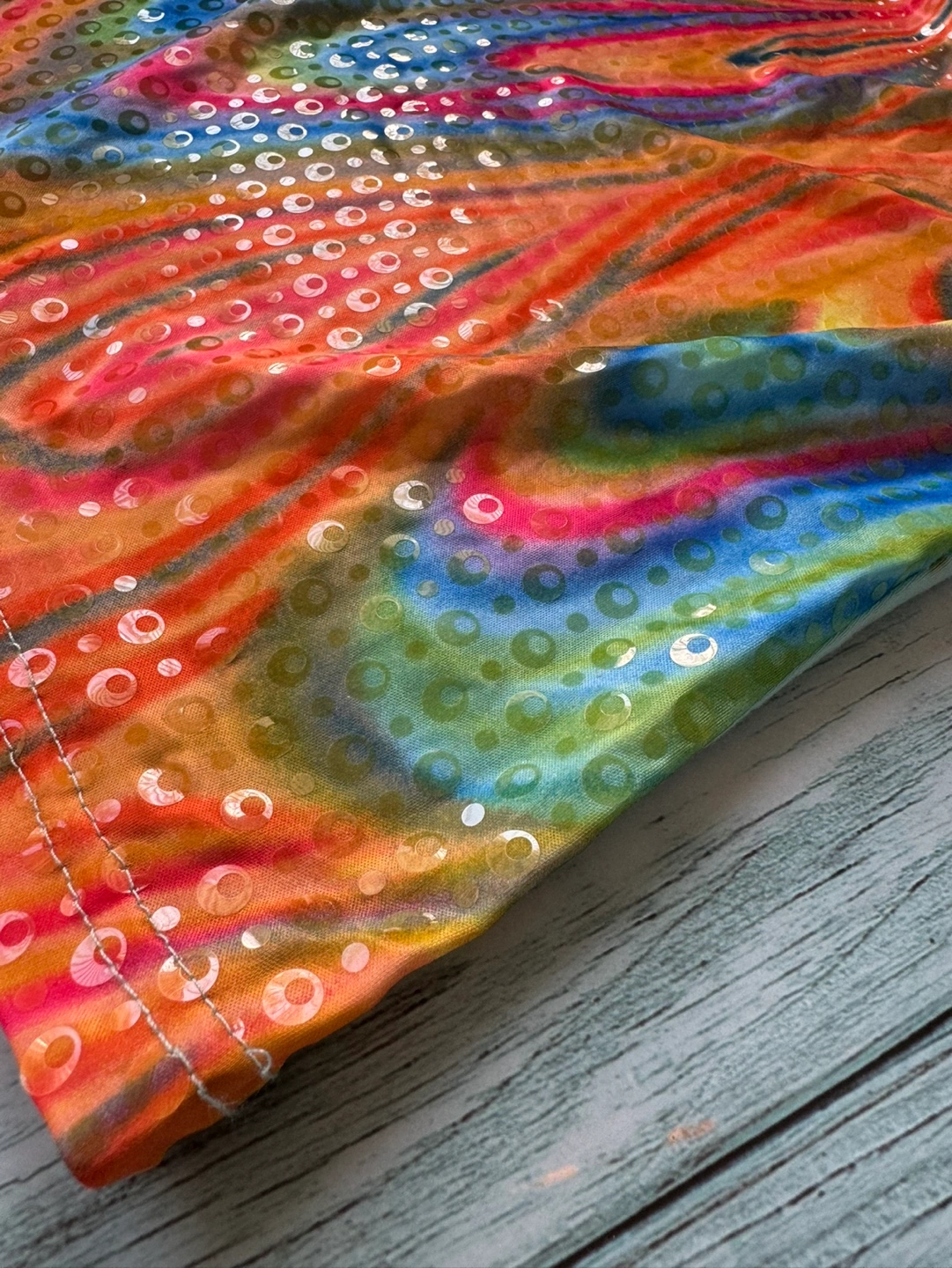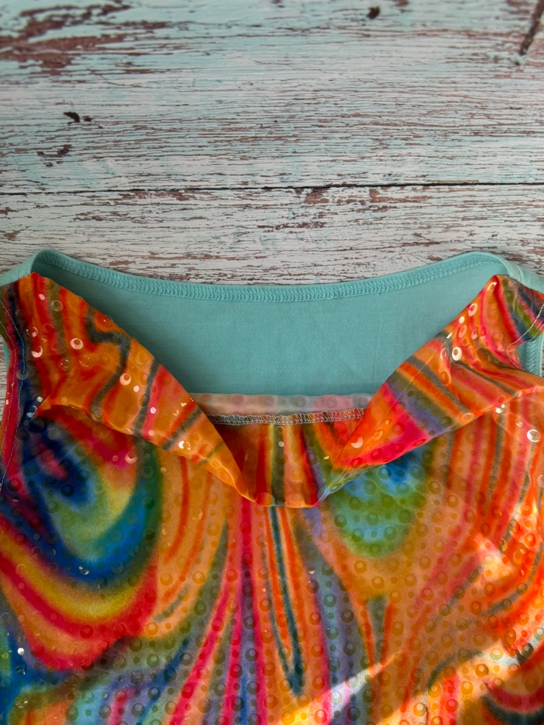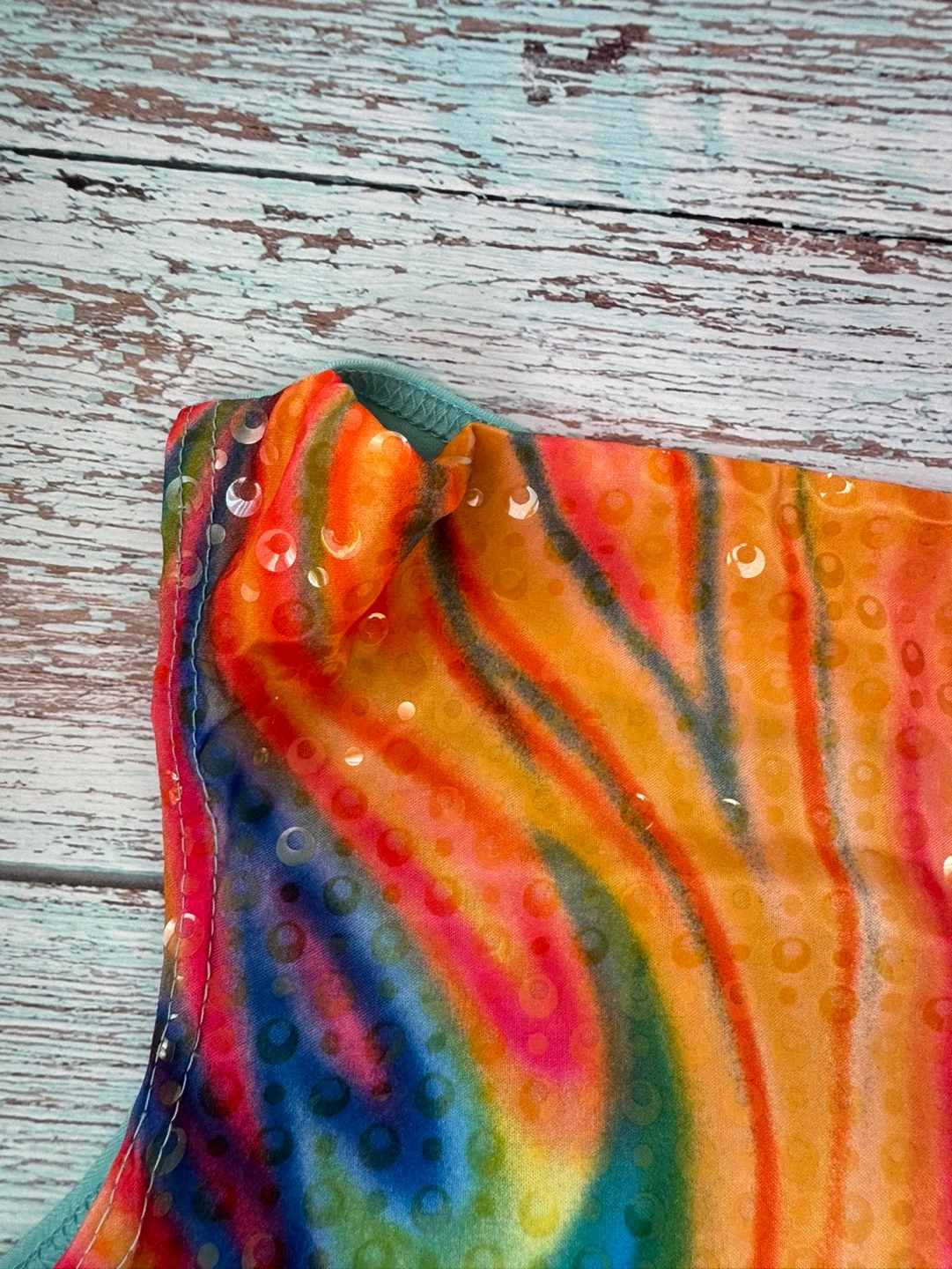 94Sleeveless tank top with a cowl neckline. Made of a sequined fabric. Features a rainbow swirl pattern.