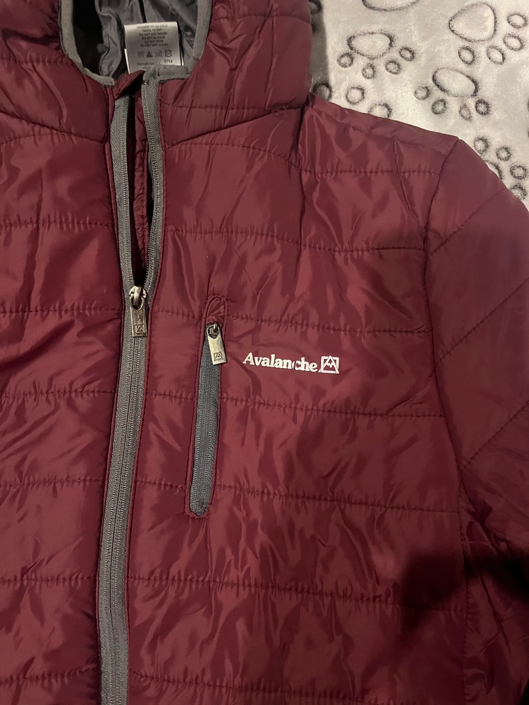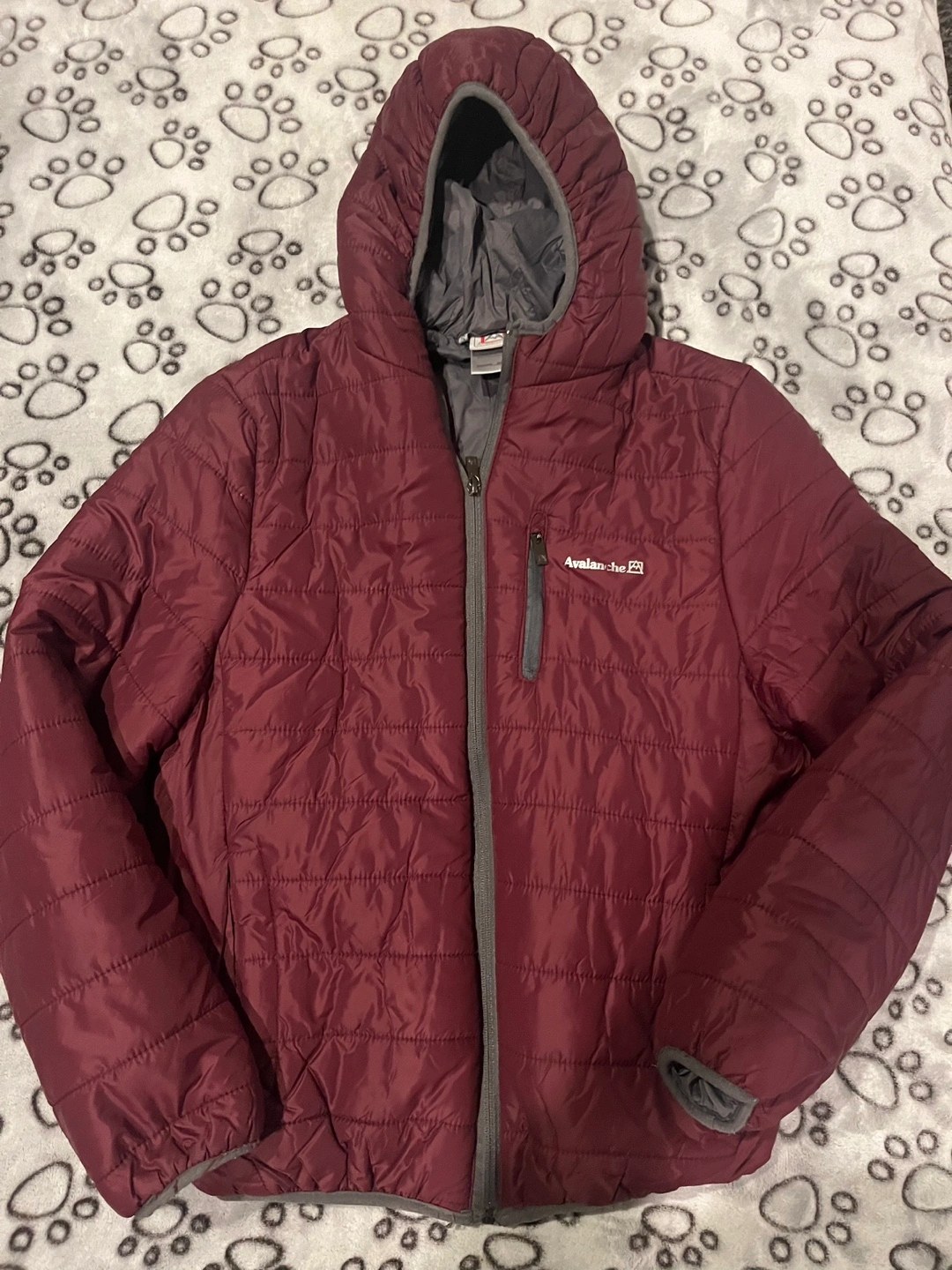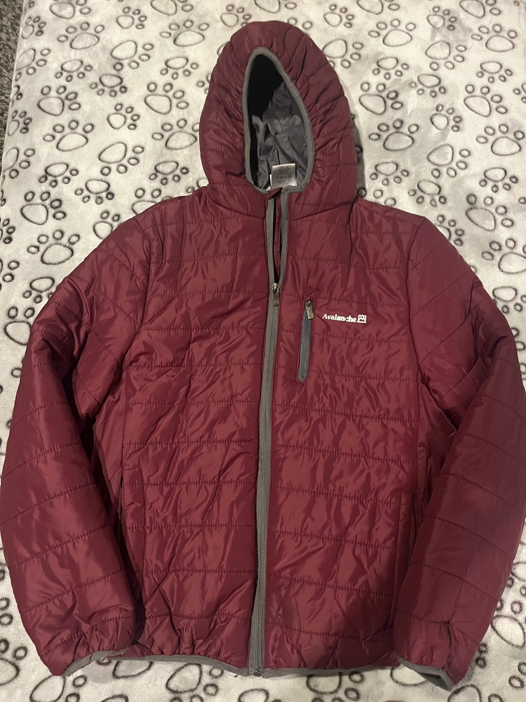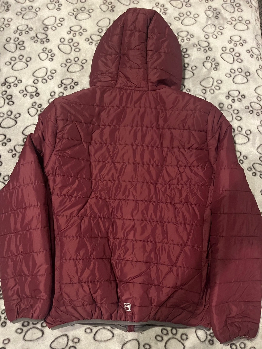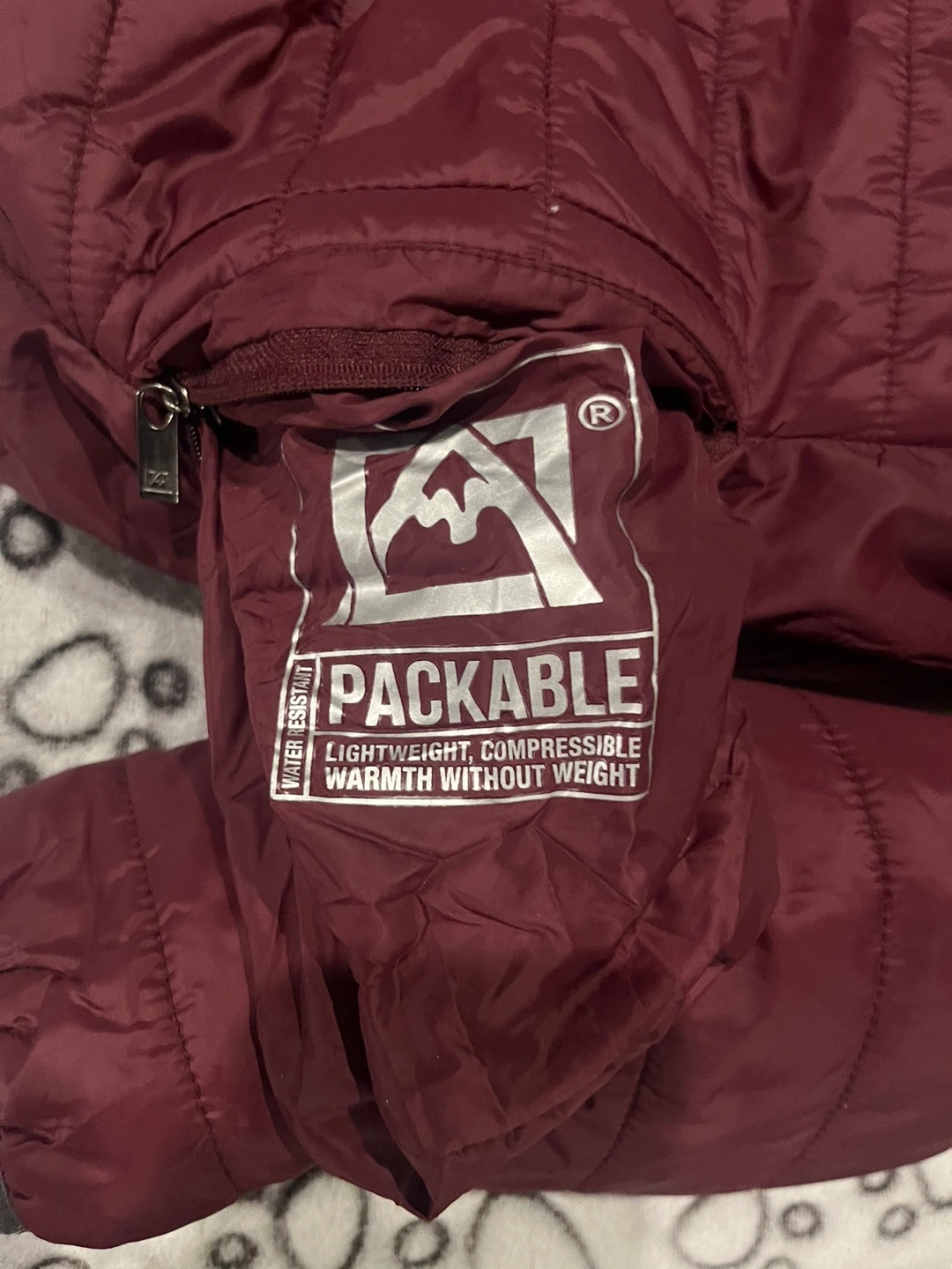 Burgundy jacket with a hood, zipper closure and side pockets. Water resistant and packable.