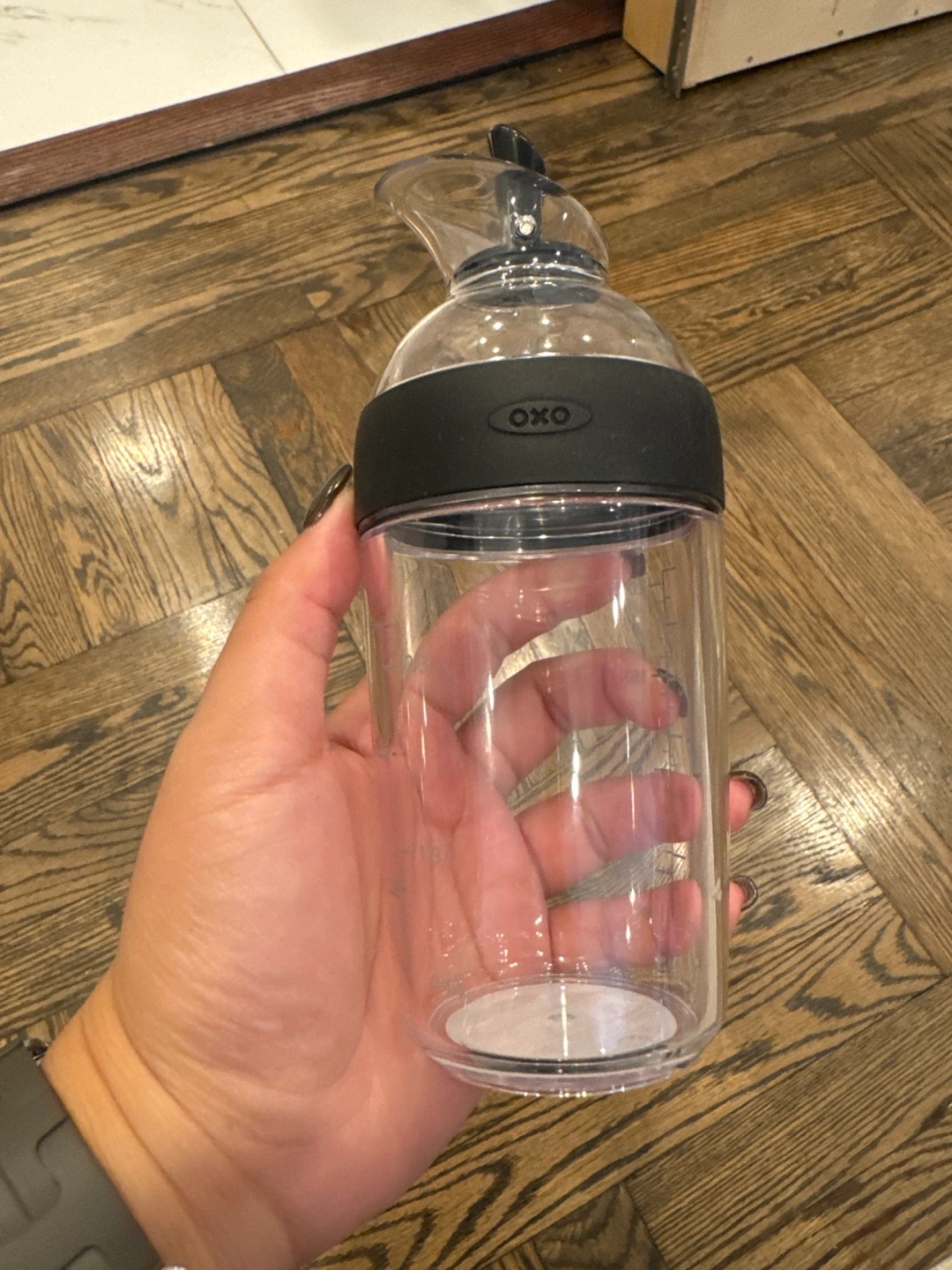 Clear glass bottle with a black lid and a pour spout. Easy to use and clean.