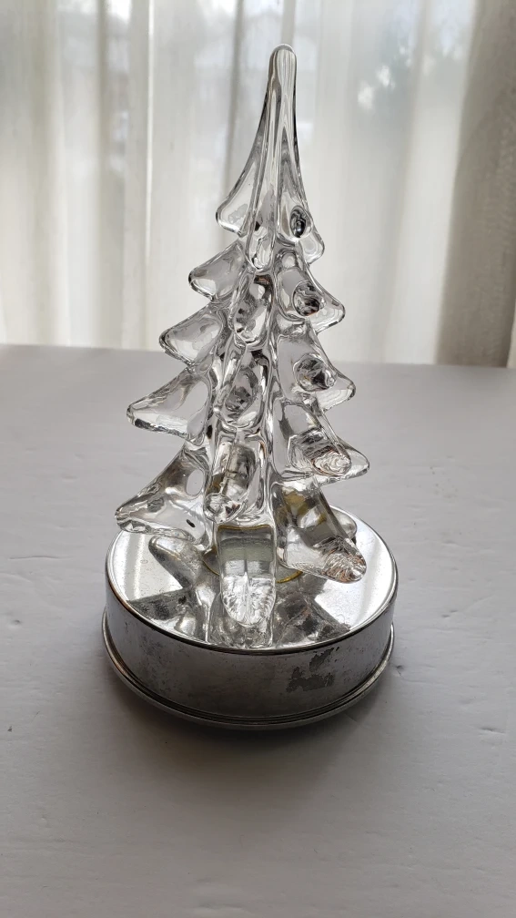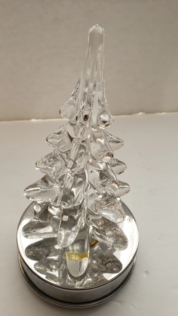 Glass Christmas tree music box. Plays a Christmas tune silent night . Has a silver base. 8" tall including base.