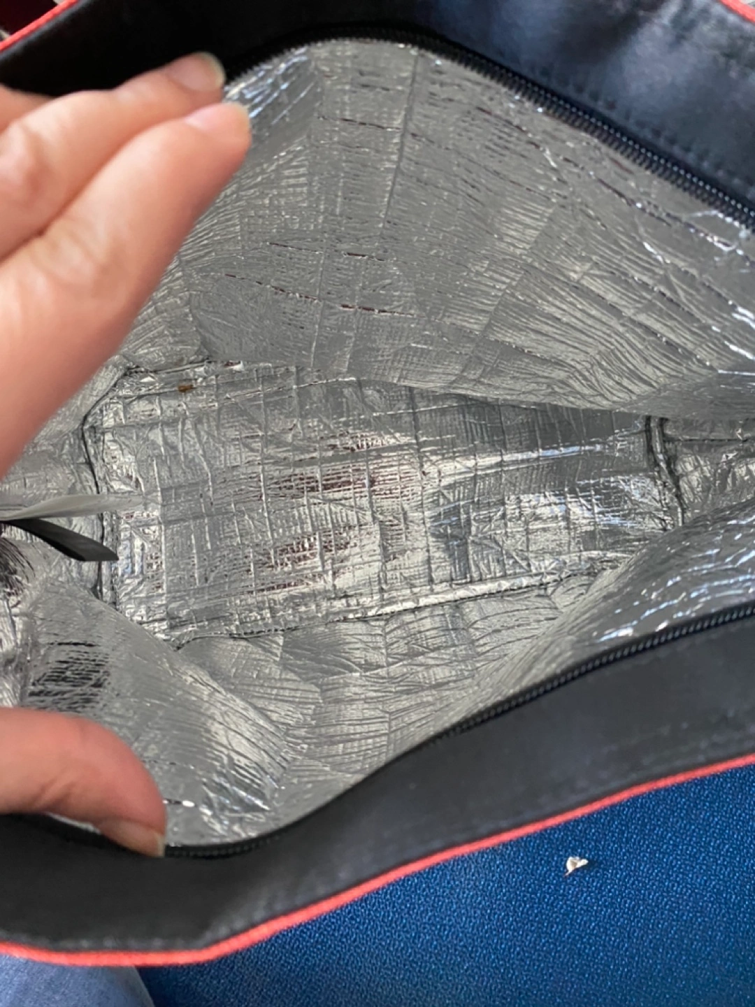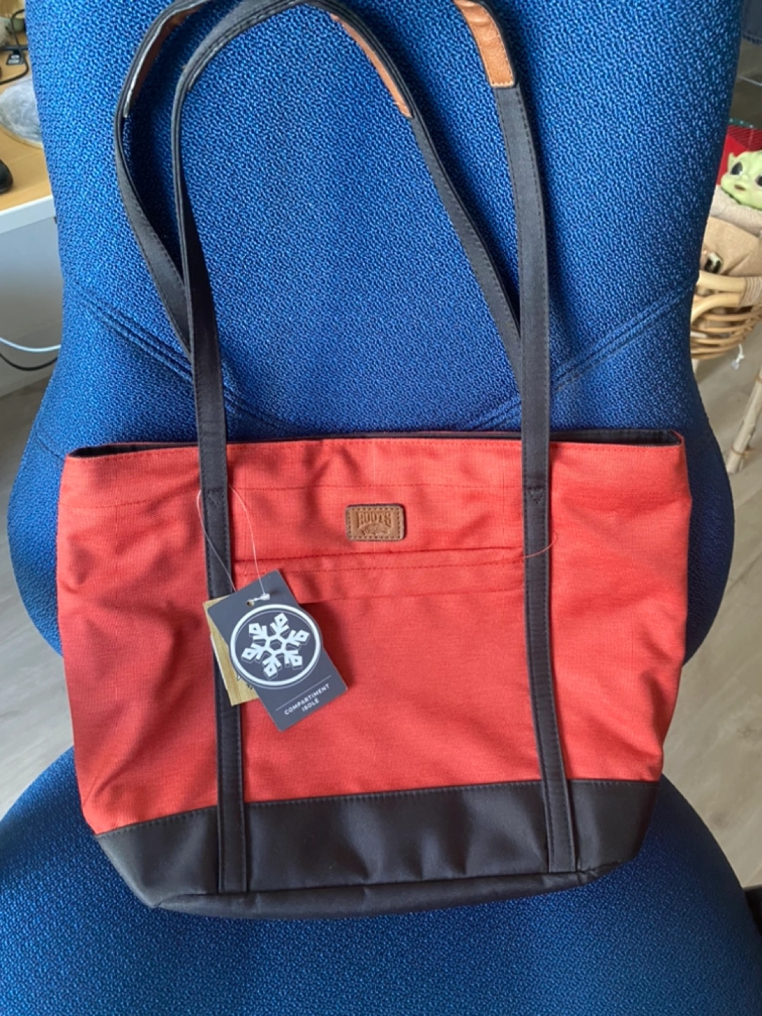 Red insulated lunch bag with black accents and a brown leather handle. Features a zipper closure and an insulated interior. Never used.