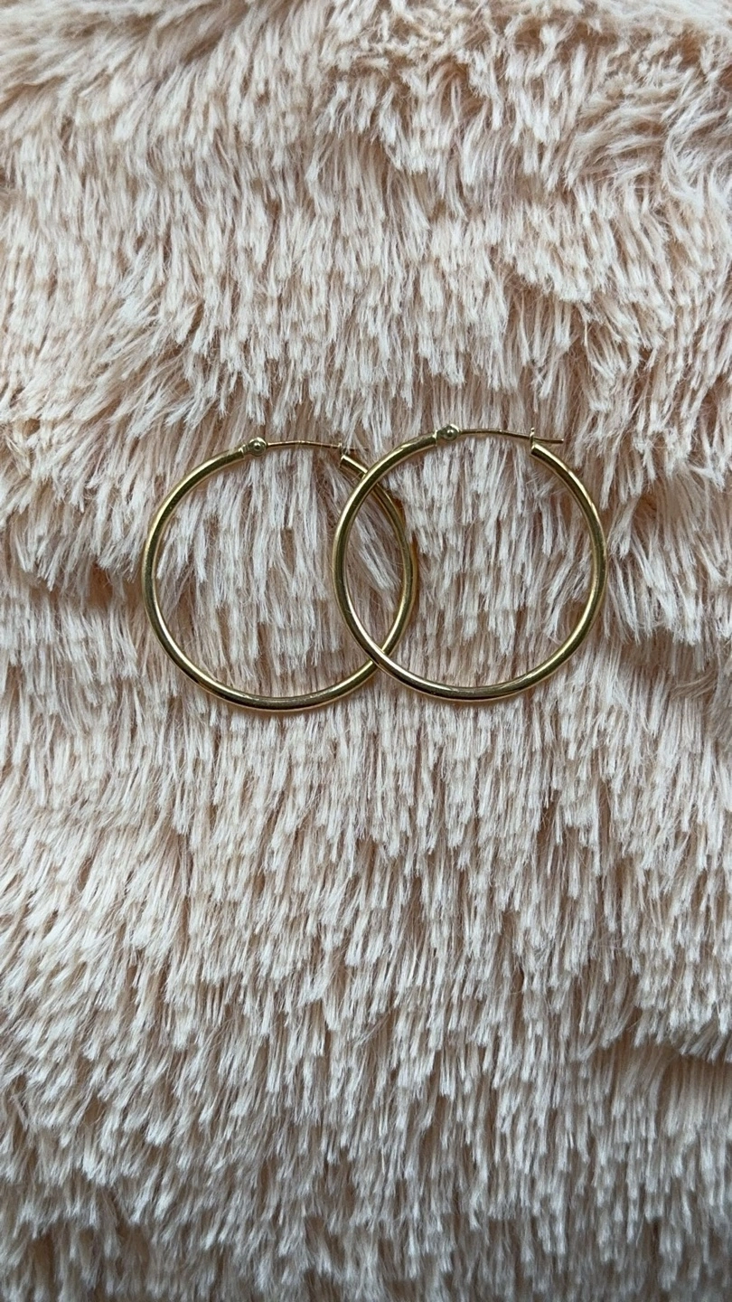 Fashioned in Real 14K gold Each earring simply shines with a medium-sized polished hoop. These earrings secure with hinged backs. Originally priced $329.99