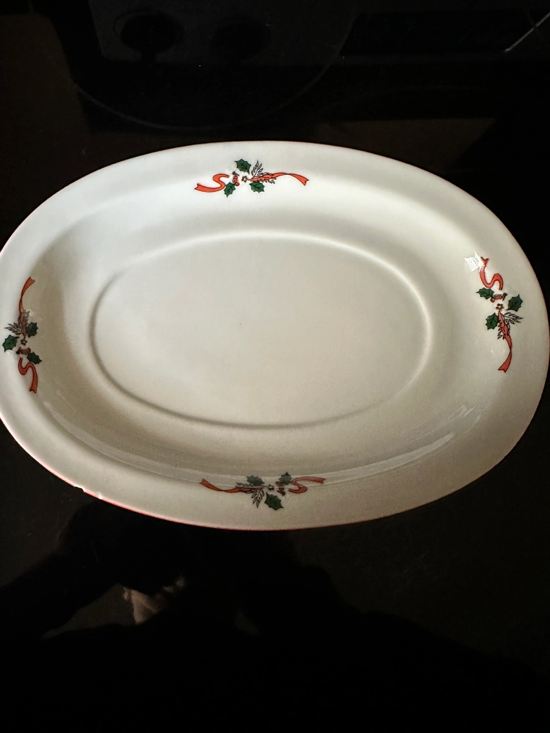 Oval plate with red trim and holly design. There is a small chip on the edge as shown in photos. Otherwise in good condition. Smoke free home.