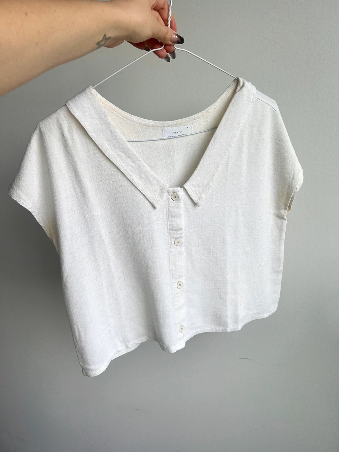 401‼️Fall Clear Out Sale‼️🍁 Help me declutter my closet ✨ Oak+Fort cropped cotton blend off white t-shirt in size Medium. Relaxed fit. True to size. Cute Peter Pan collar 🧡 Wash with like colours in cold water in delicate cycle. Pick up from Steeles and Dumont Street. ✨