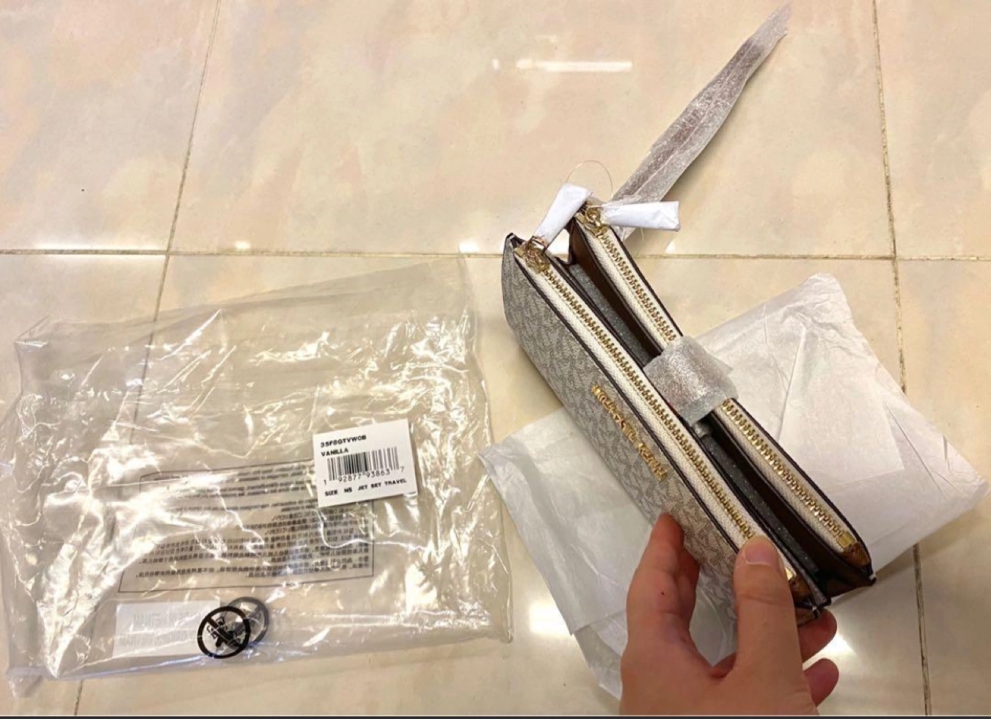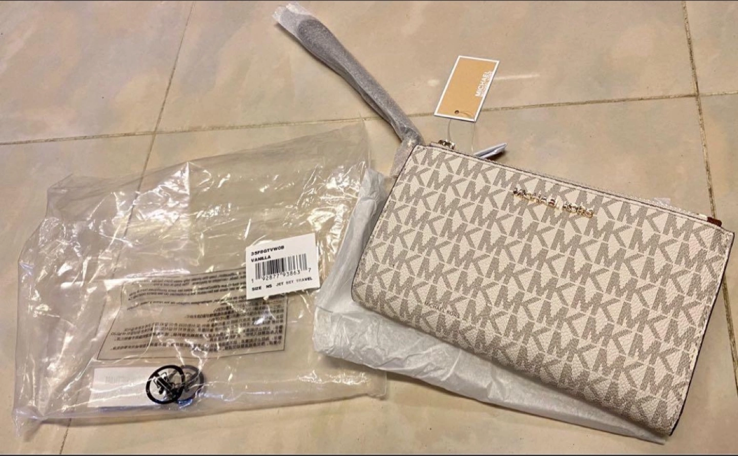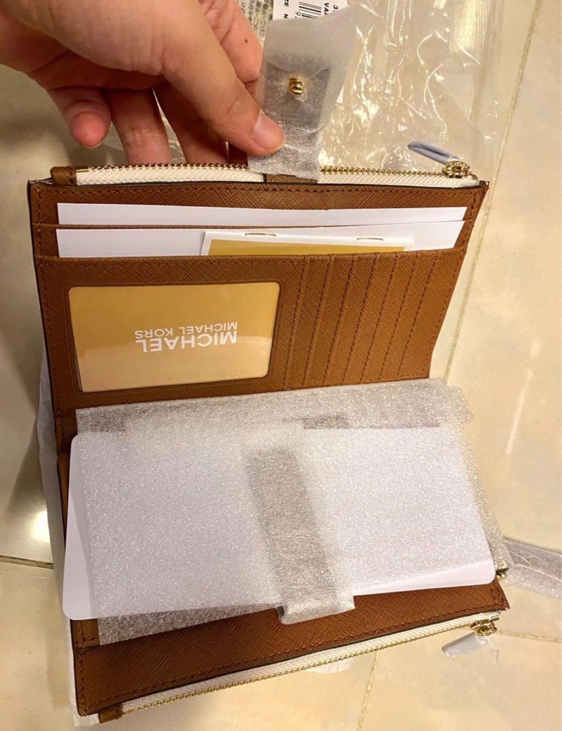Brand new wallet with a zip around closure. Features a logo pattern and multiple card slots and pockets.