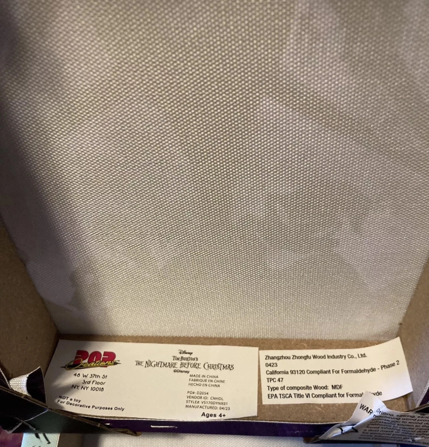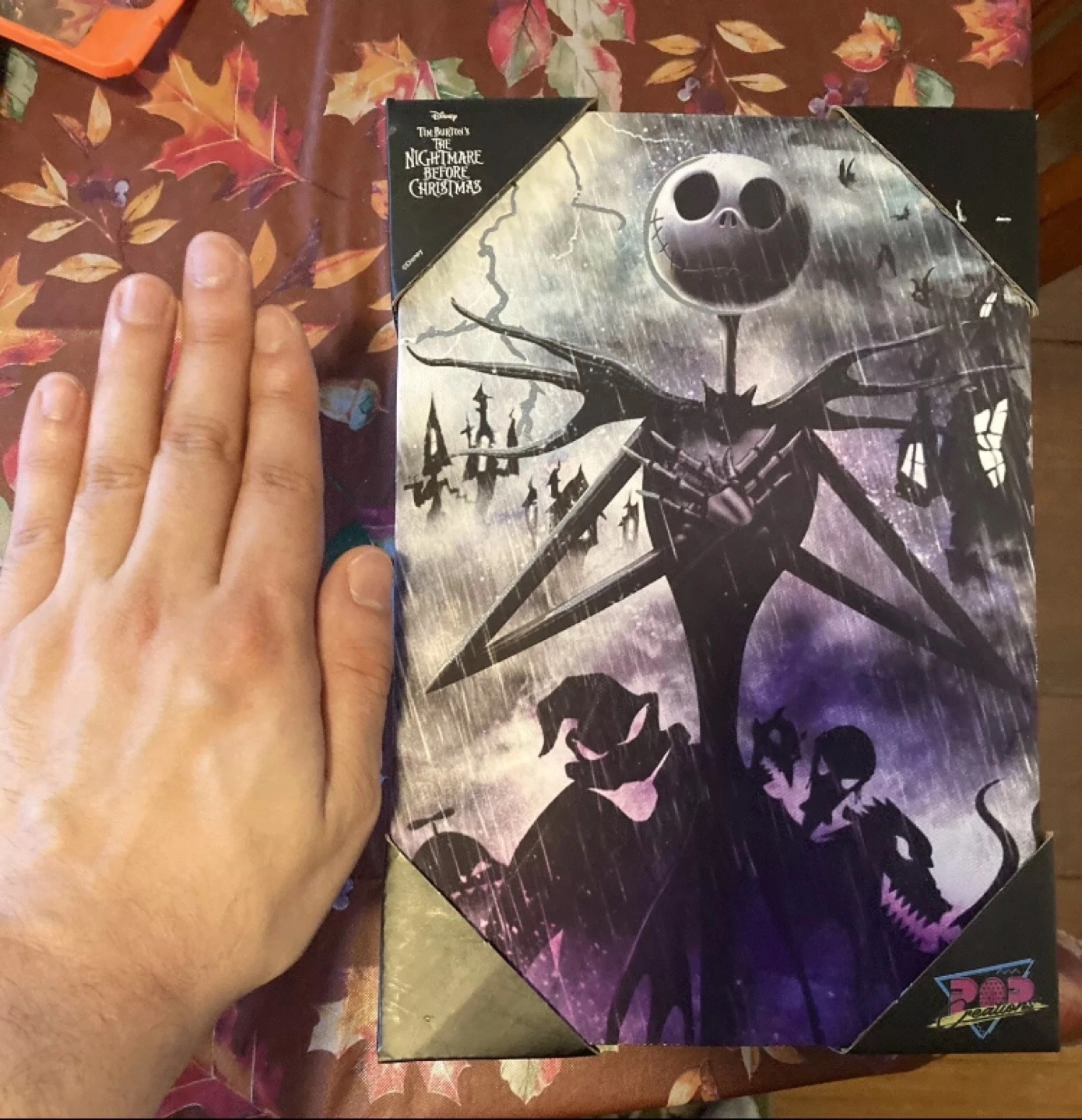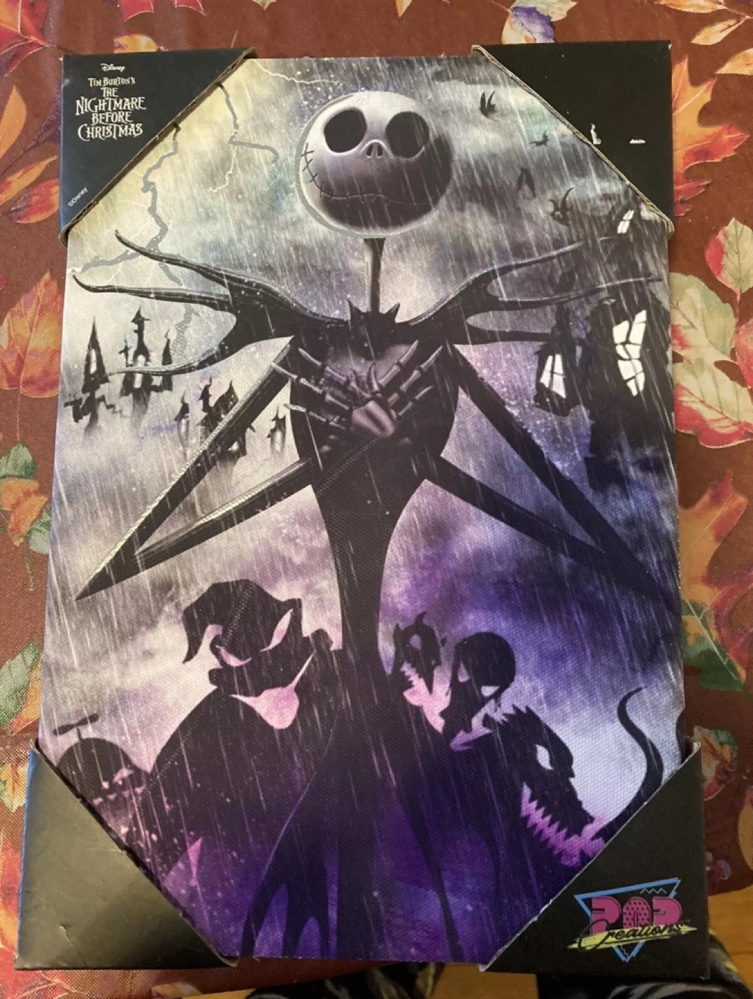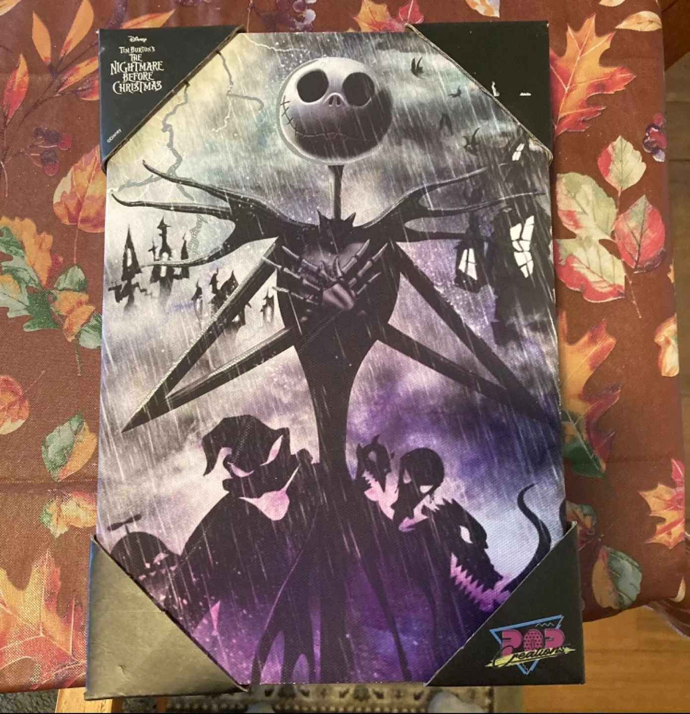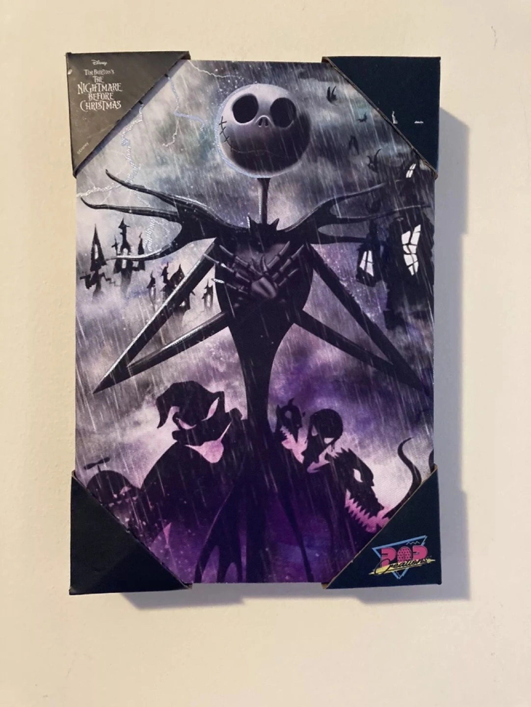 Framed canvas wall art featuring Jack Skellington from The Nightmare Before Christmas. Comes with a built-in stand or can be hung. 16x20 inches.