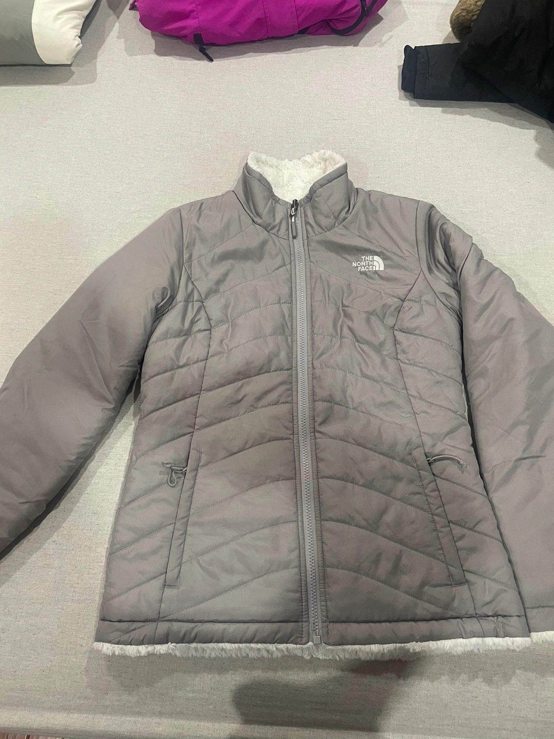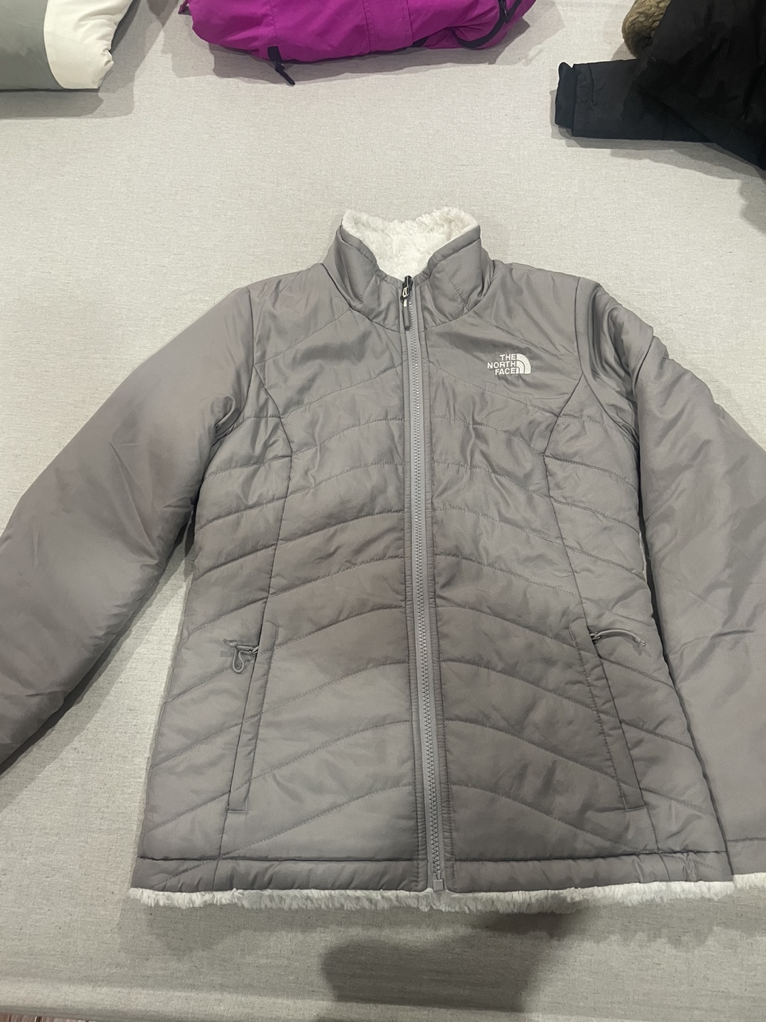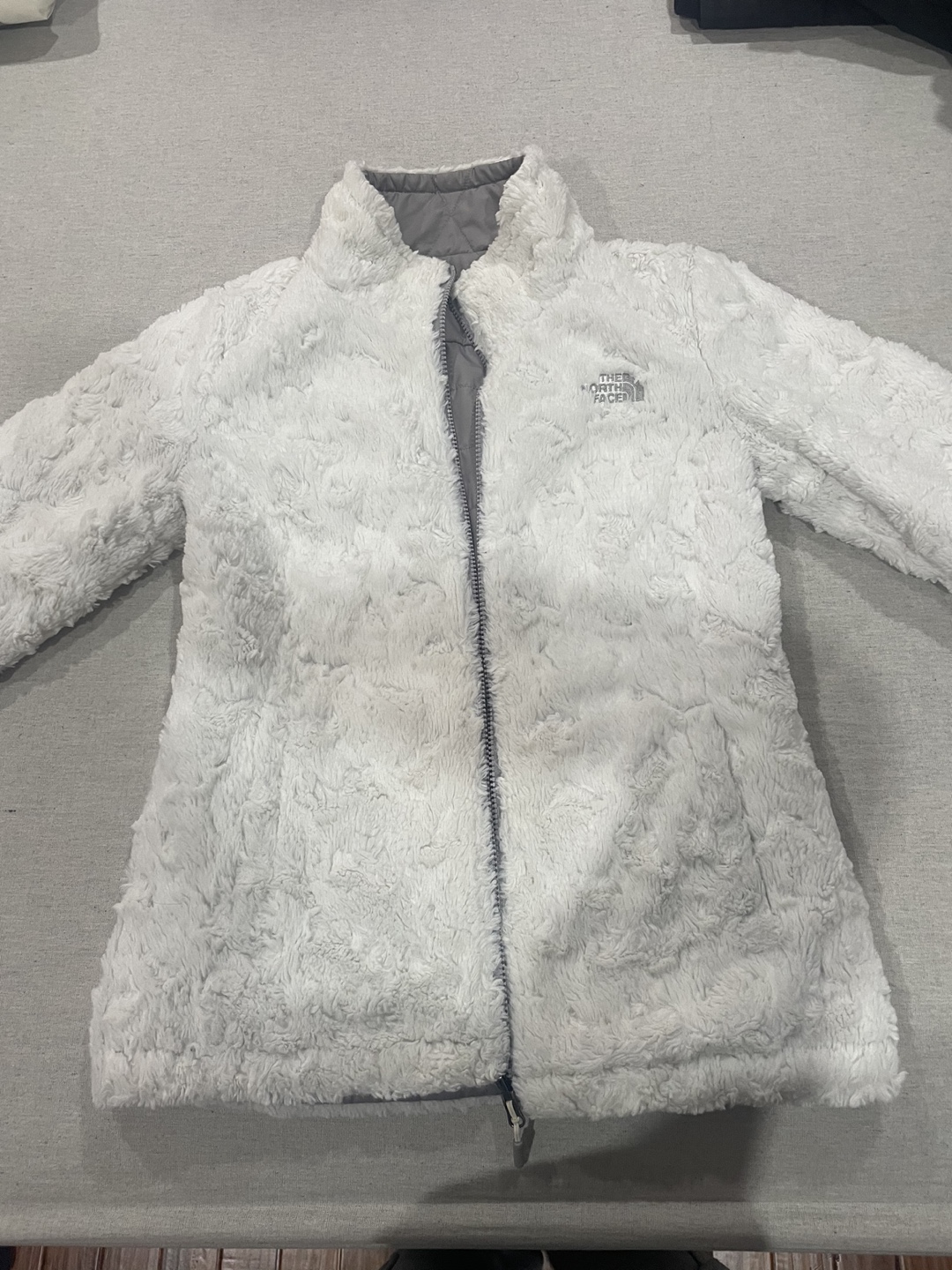 Reversible jacket, grey on one side and white faux fur on the other. Zip closure, pockets on both sides. Very cozy and perfect for winter. No hood but you can attach one.