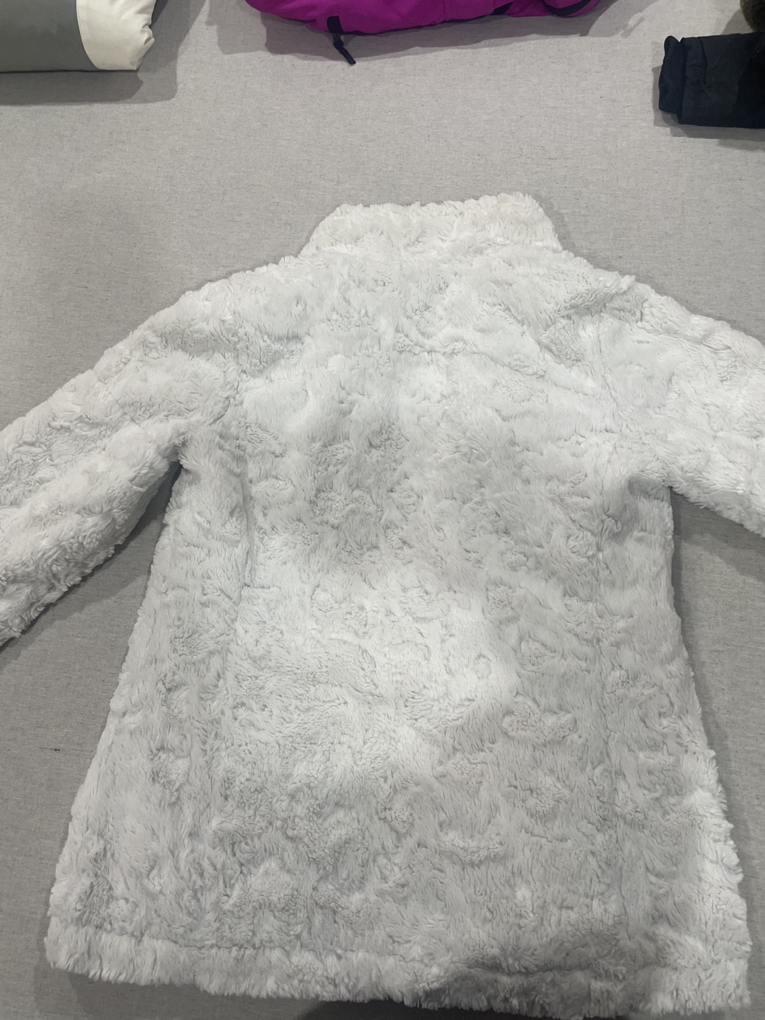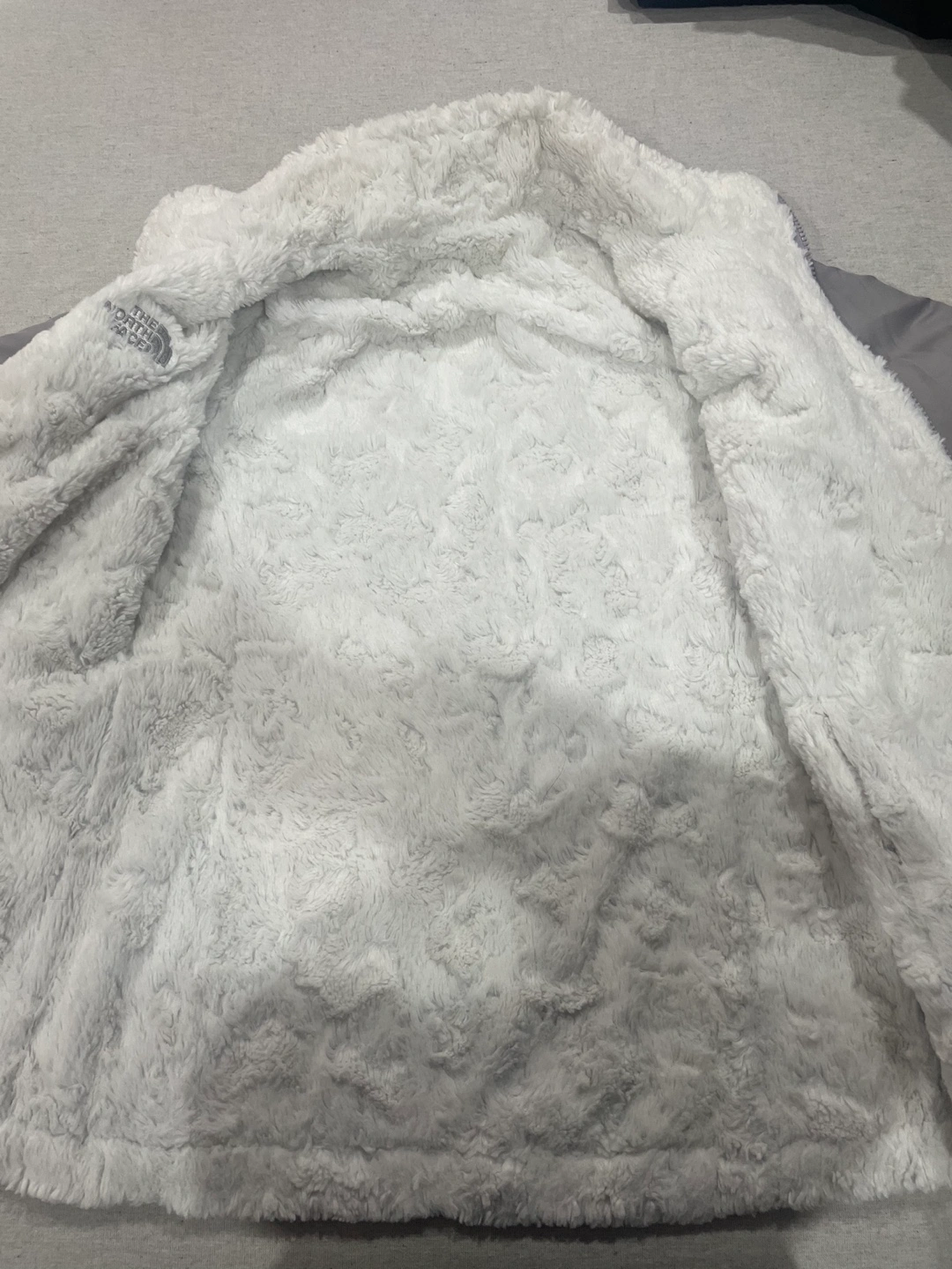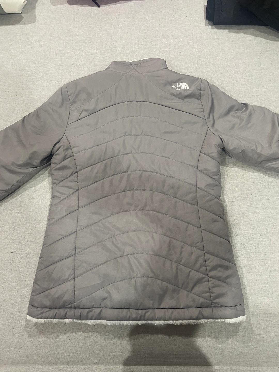 Reversible jacket, grey on one side and white faux fur on the other. Zip closure, pockets on both sides. Very cozy and perfect for winter. No hood but you can attach one.
