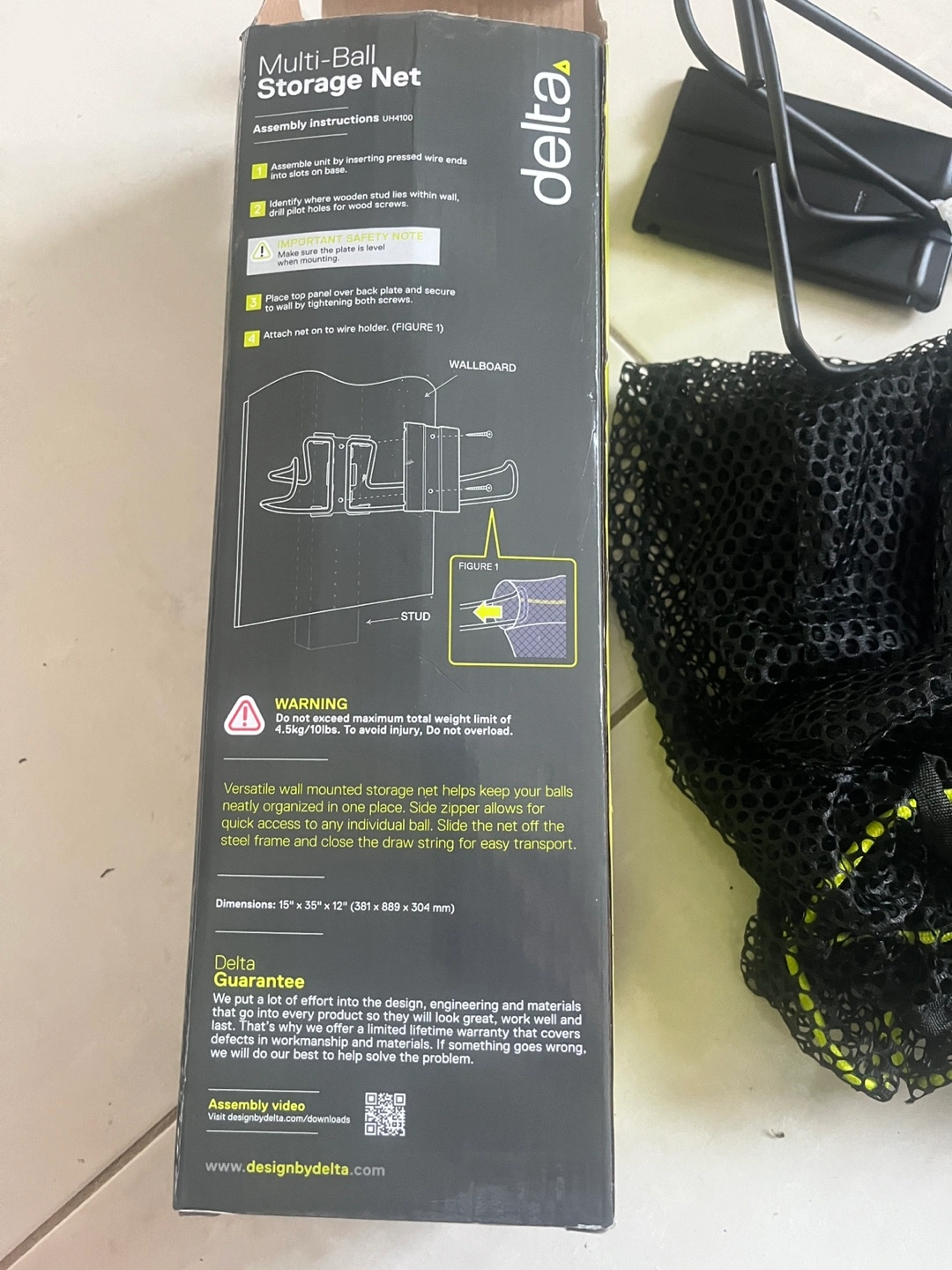 Brand new. Box opened but item has never been used. Wall mounted storage net. Holds 5 or more balls. Side zipper for easy access and ball removal. Removable net for portability. Smoke free and pets free home.