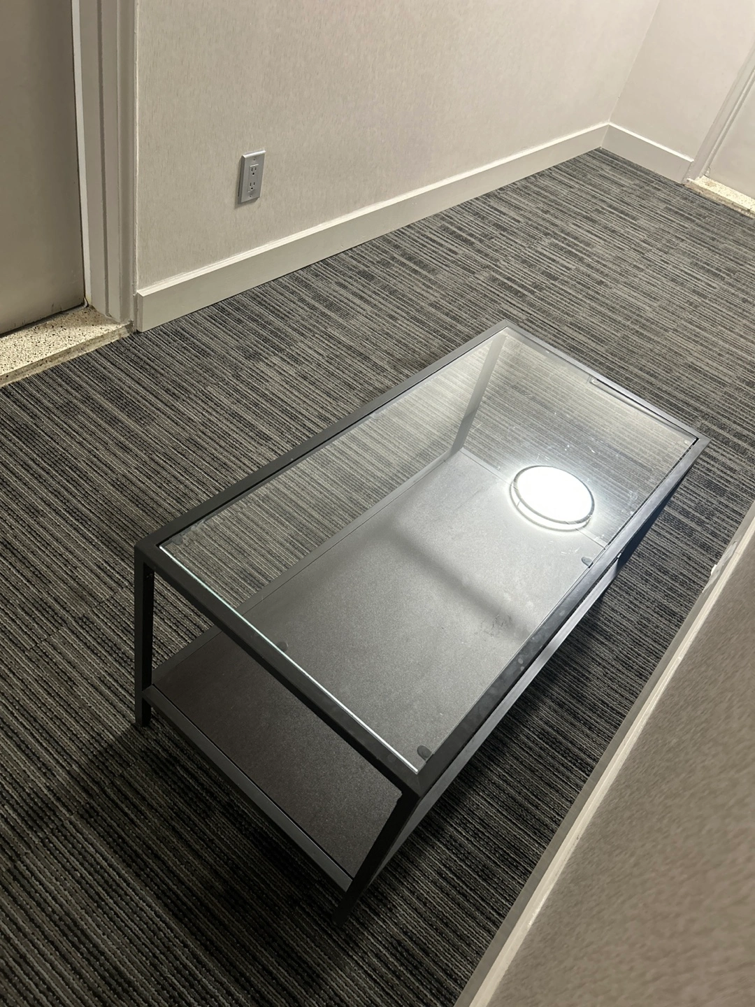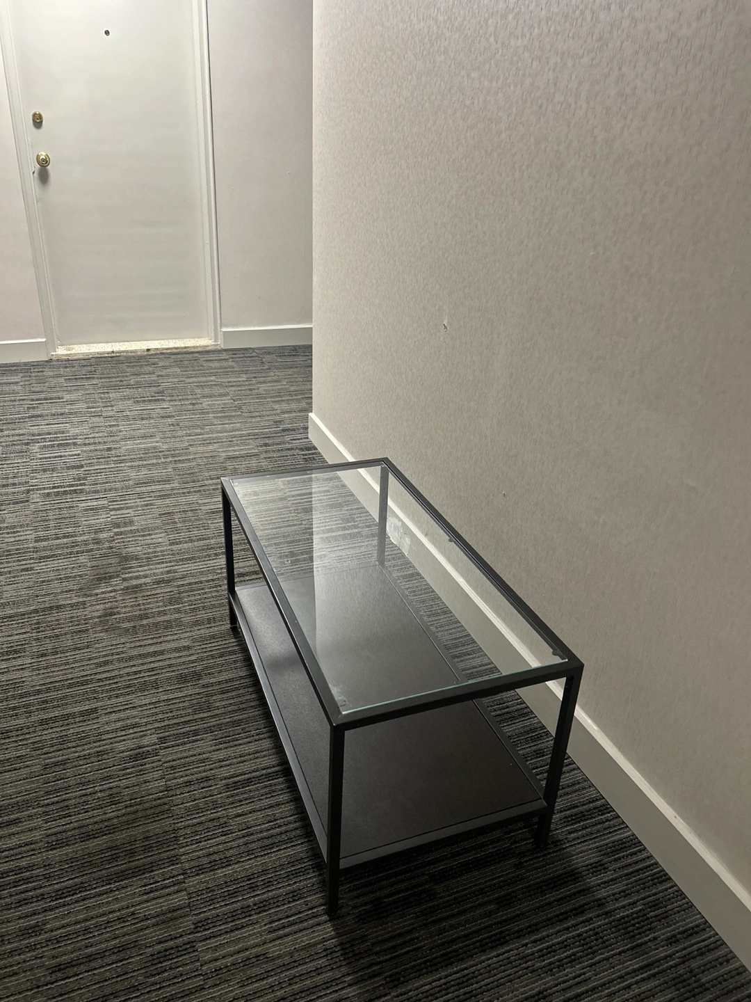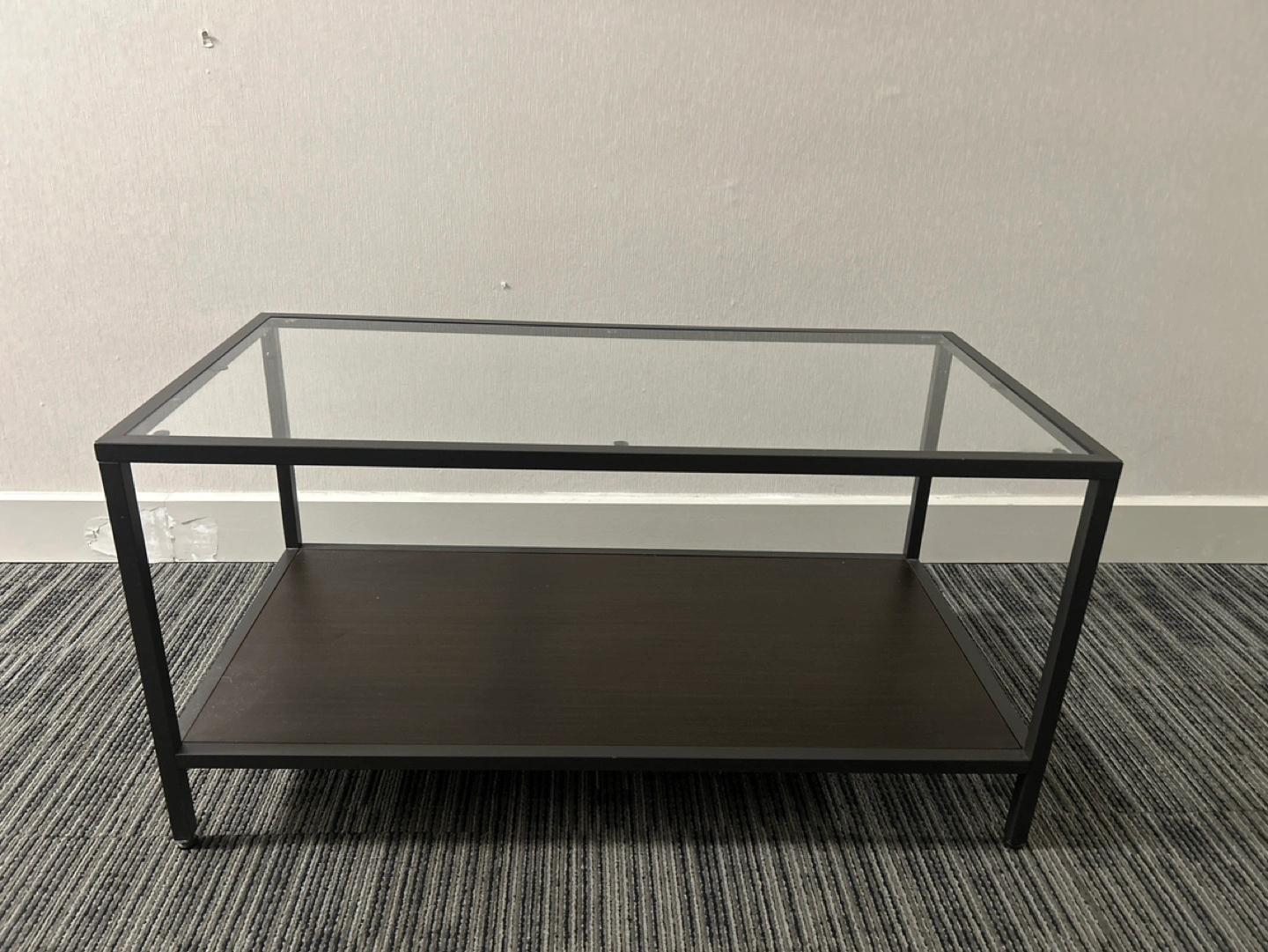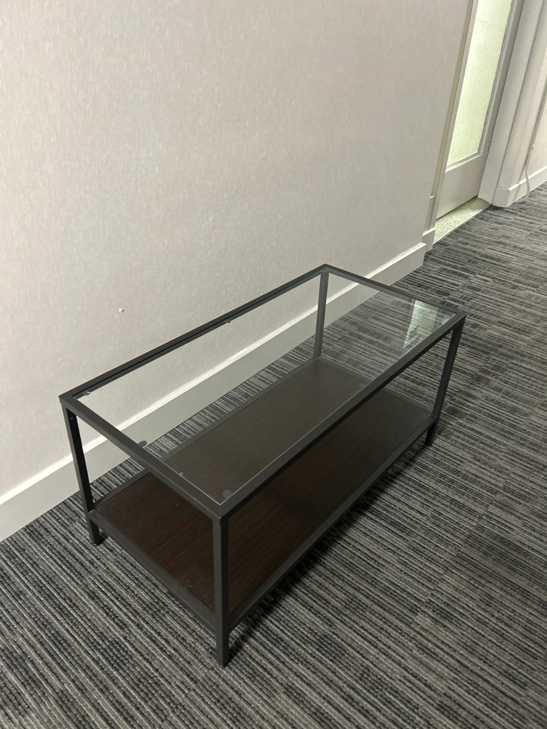 438Black metal frame with a glass top and lower shelf. Great for small spaces. No issue, no scratch, no dent Pickup only. Pls. Thank u Rfs: moving out