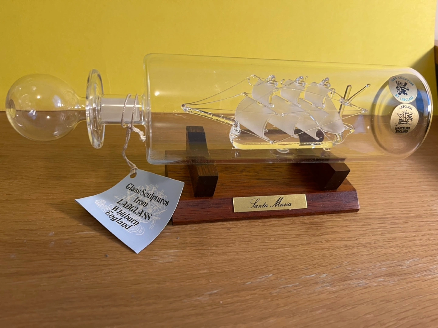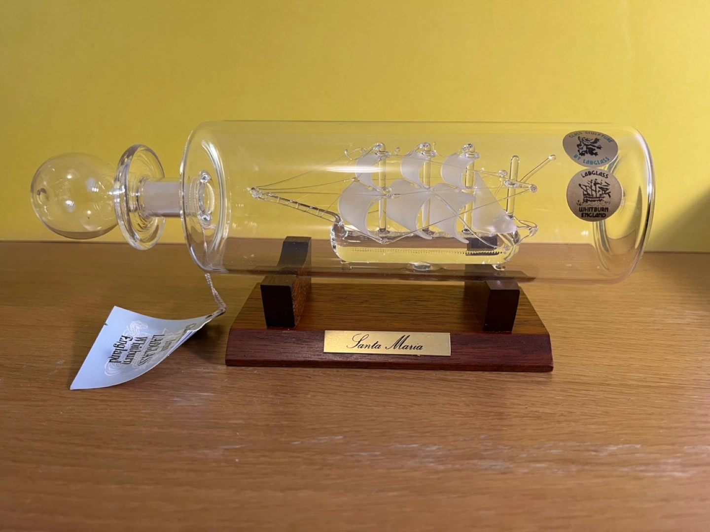 Glass sculpture of Santa Maria, within a glass bottle. It sits on a wooden stand engraved with the ship’s name.