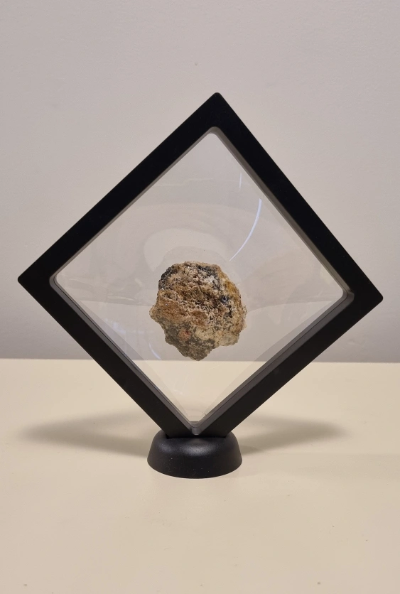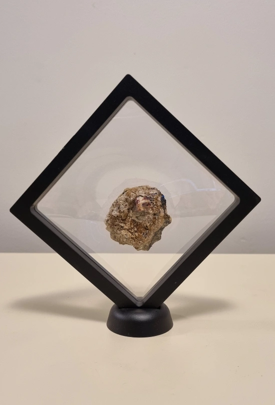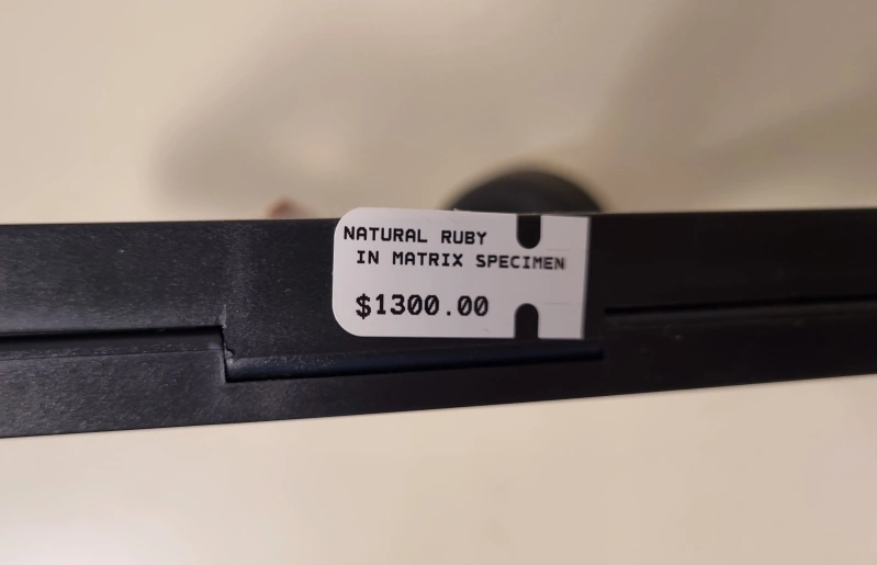 54Natural ruby in matrix specimen, in a display case with a black stand.