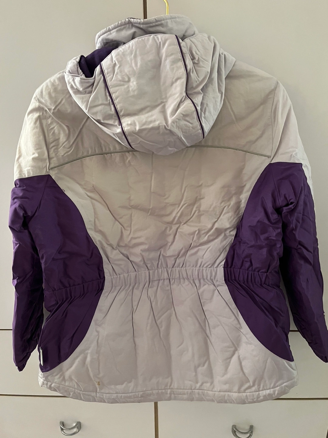 Youth sized purple and grey winter jacket with a detachable hood. It has a zipper closure, elastic waist band and multiple pockets. Size L. For age 9 and older. Brand Pacific Trail outdoor wear. Excellent condition, like new. If ad is up, the jacket is available.
