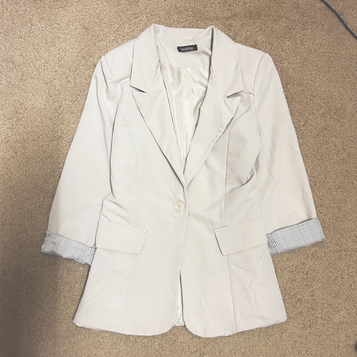 Cream coloured blazer with a button closure, shoulder pads and striped cuffs. It has a fitted waist style. Fits a small-medium body.