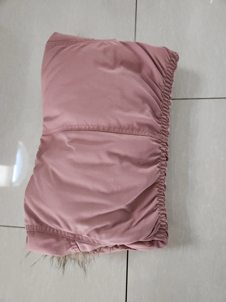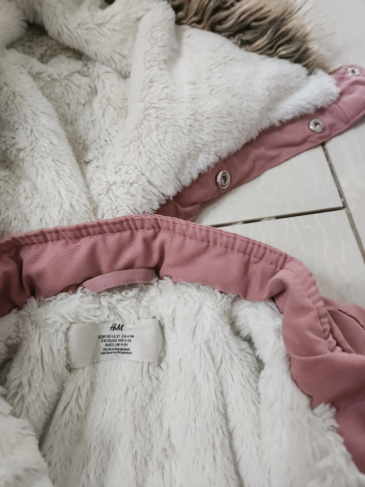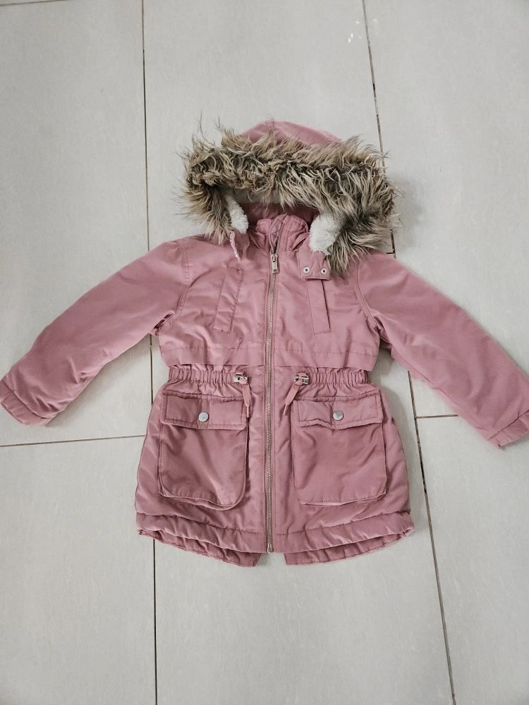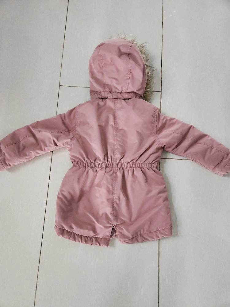 Pink winter jacket with a faux fur-lined, detachable hood. Zipper closure and pockets. Size as shown on 3rd photo.