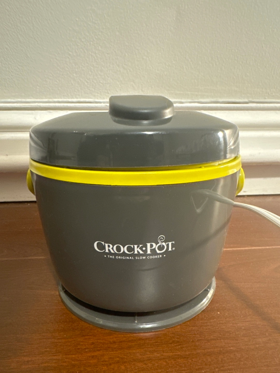 Small Crock-Pot food warmer, grey and yellow. Brand new, used only once. Has a removable inner pot.