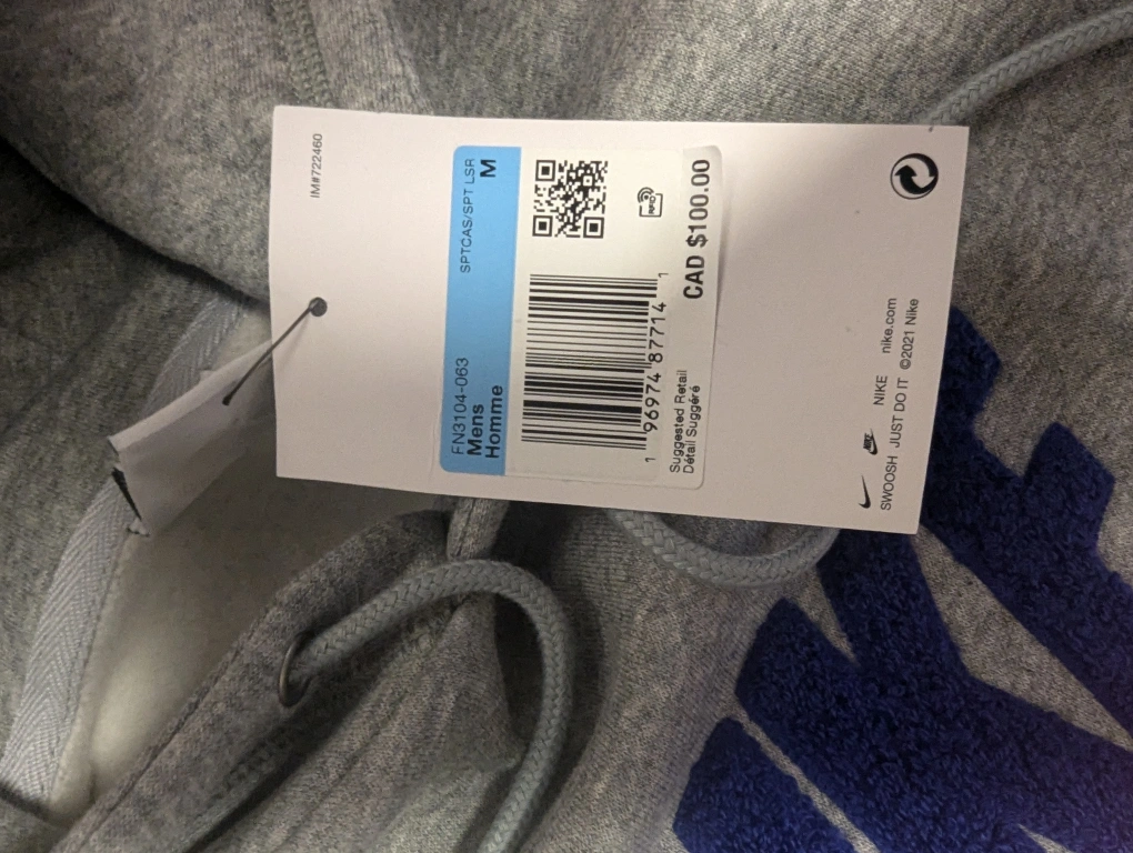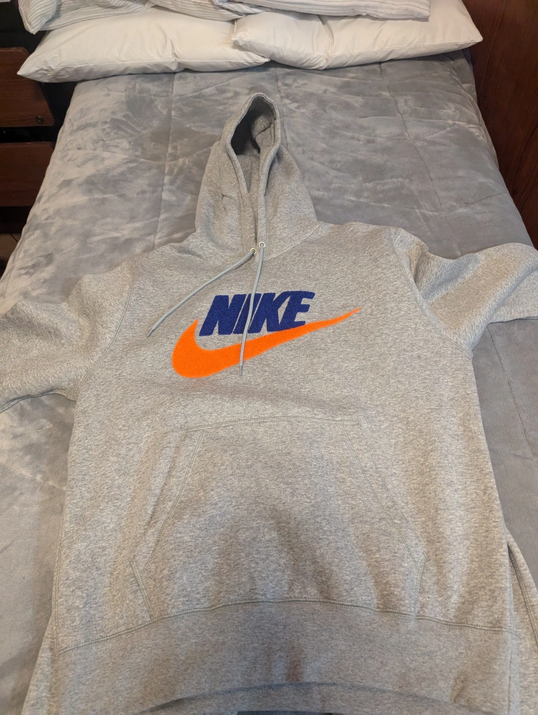 Grey Nike hoodie with orange and blue logo. Size M. Brand New, never worn, Tags still on, $100 before taxes, makes a perfect gift for a loved one. Also can come with matching jogging pants with same colour and premium textured blue and orange NIKE / Swoosh logo