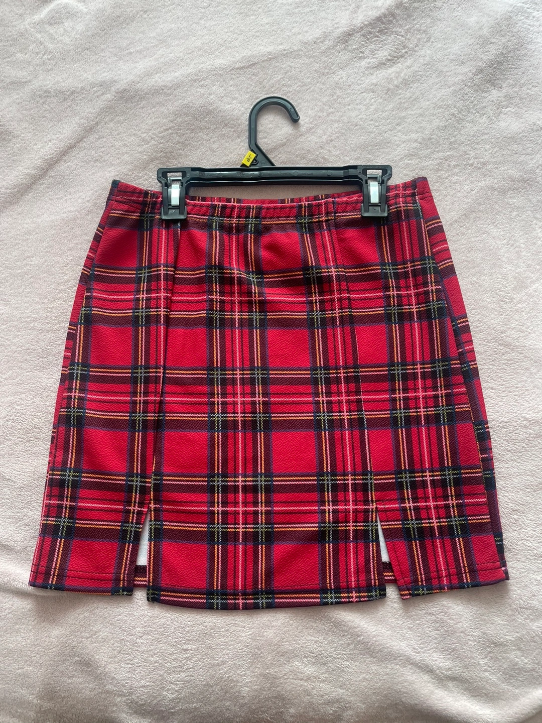 Red plaid mini skirt with a slit on the side. Size M.