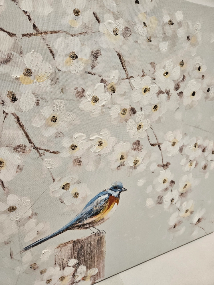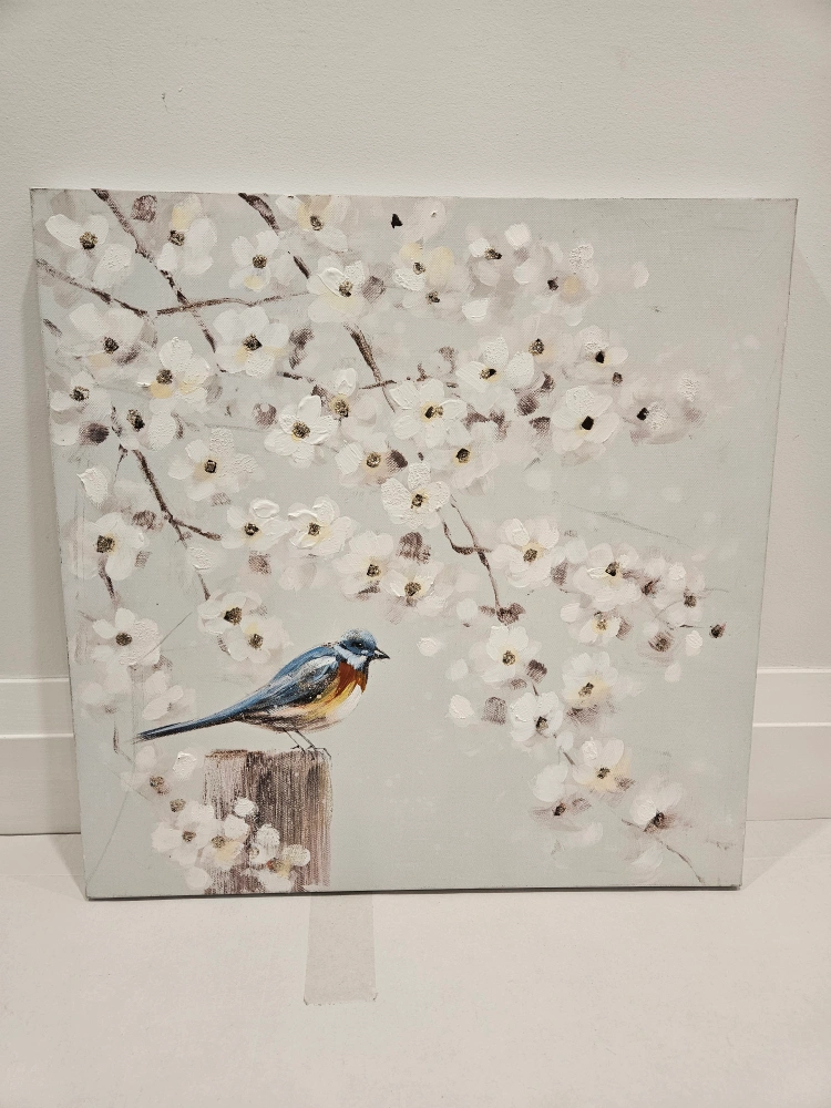 Beautiful canvas wall art featuring a bluebird perched on a branch with white flowers. No frame. Bird and flower art 20 x20 inch Check my other ad