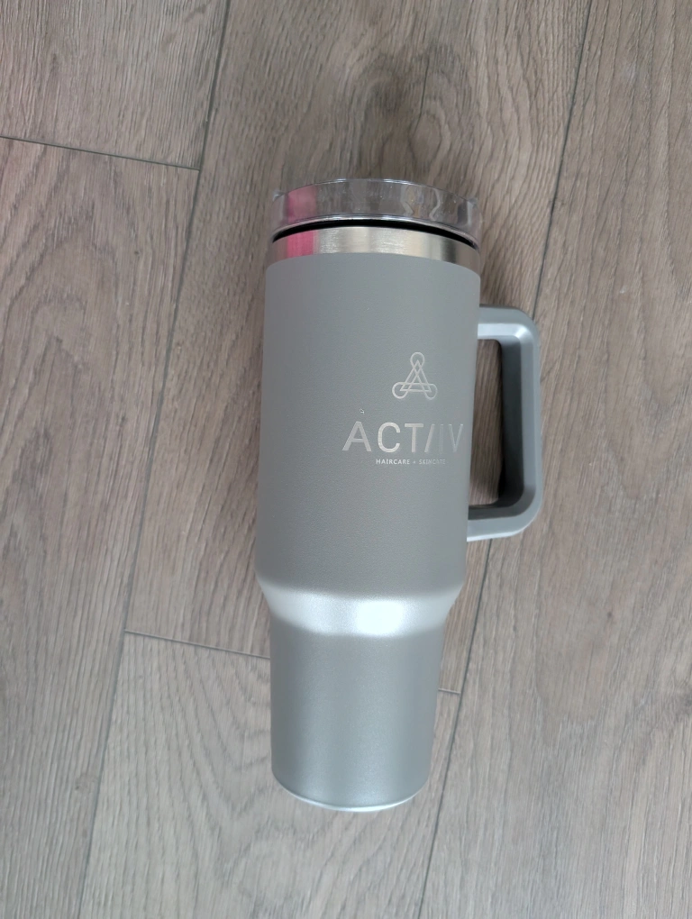 Stainless steel travel mug with handle and lid. Keeps drinks cold or hot for hours. Great for on the go!