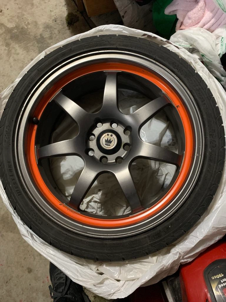 Ai Says..Grey with orange lip, 5x100 bolt pattern, 17 inch wheels with tires. Good condition.