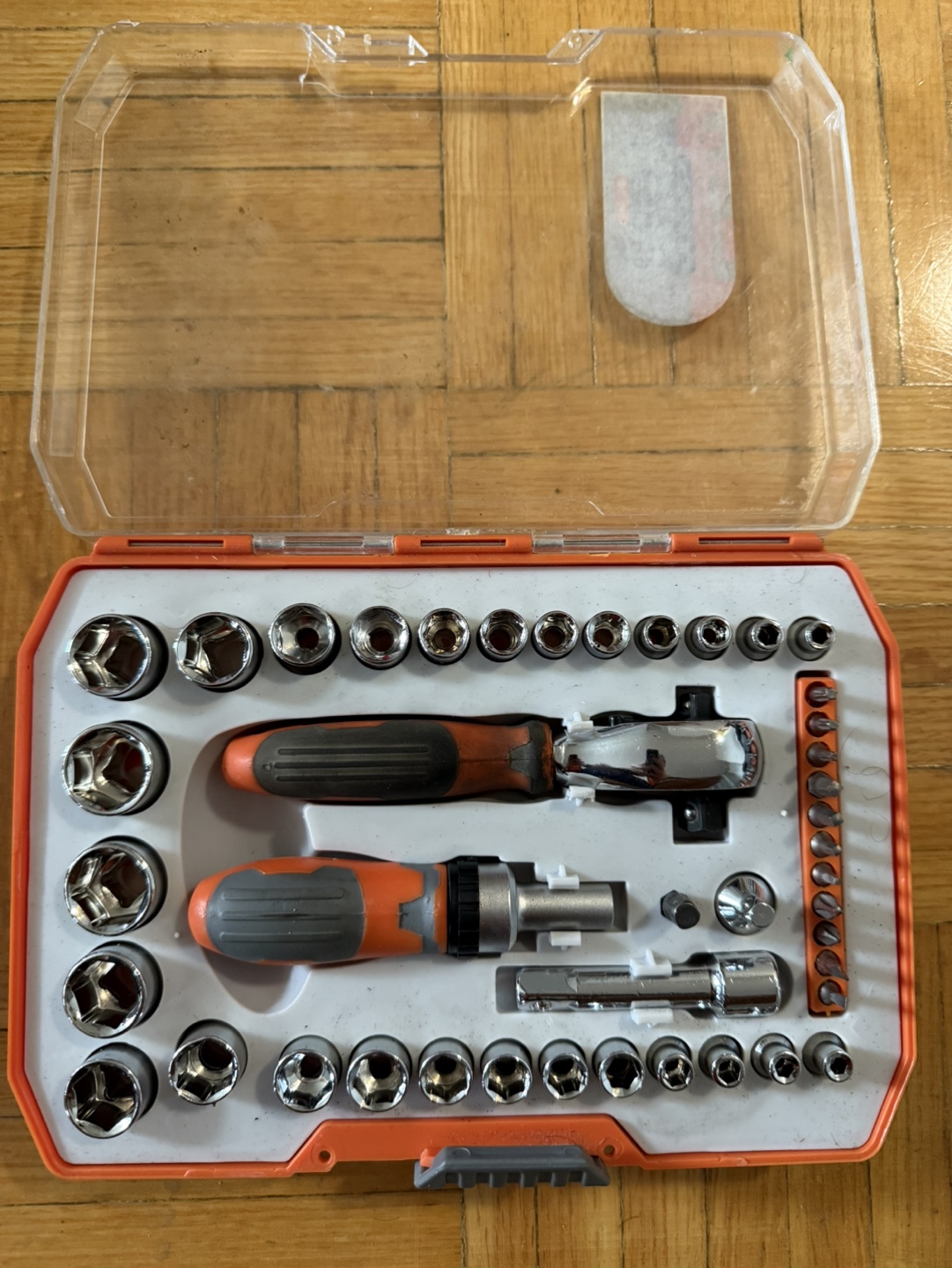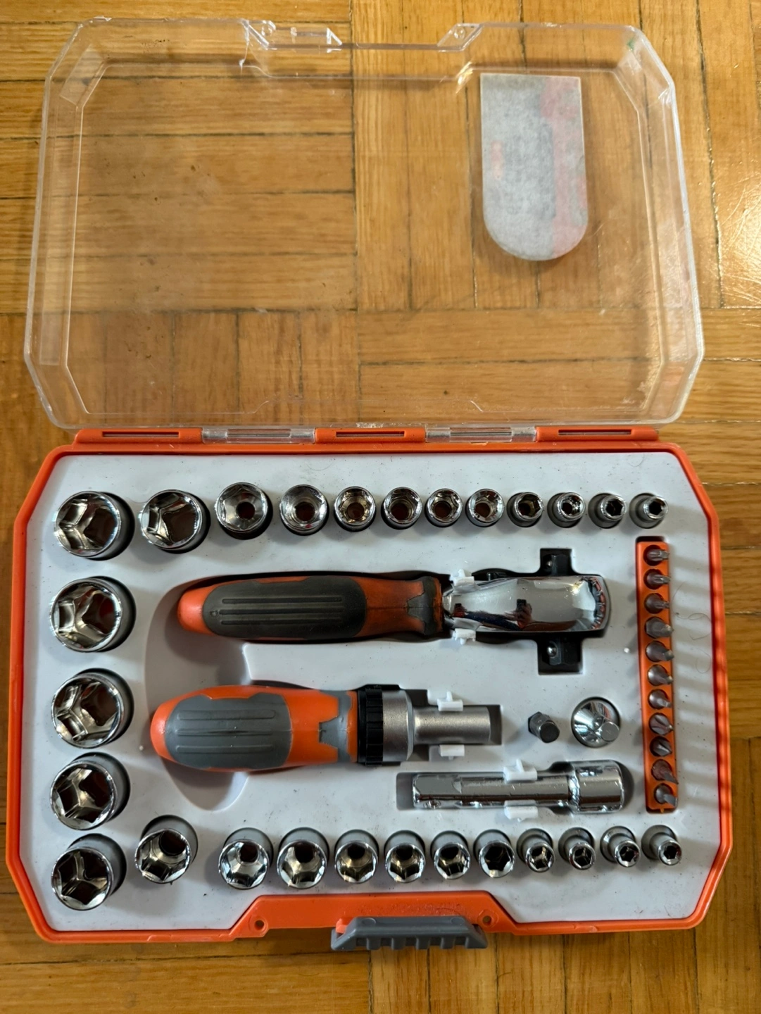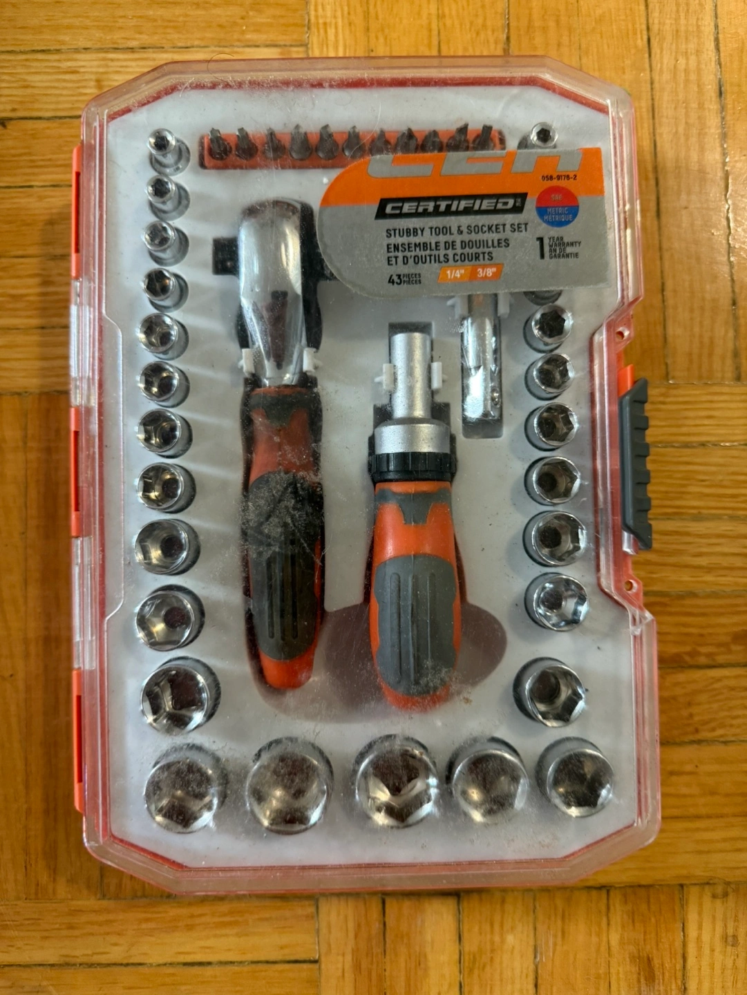Stubby tools and sockets, 43 pieces, 1/4" and 3/8" drive.