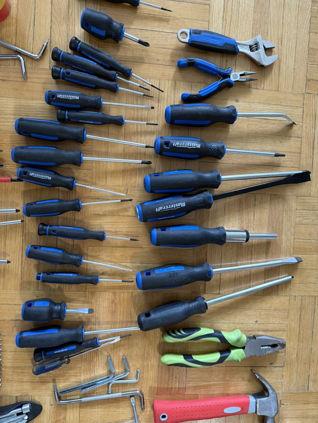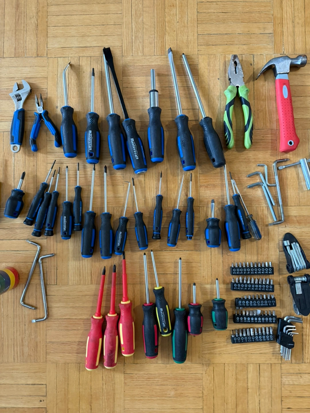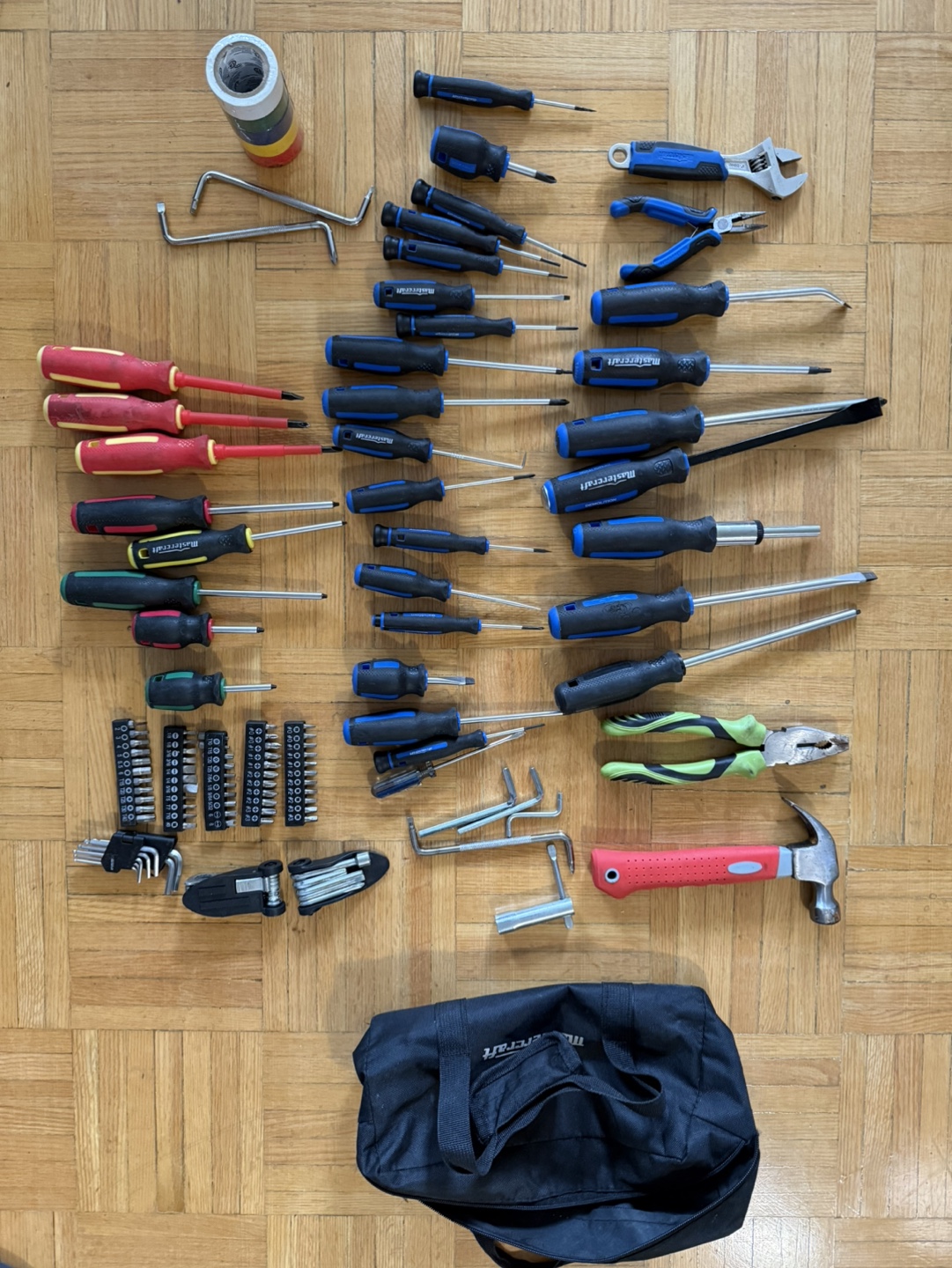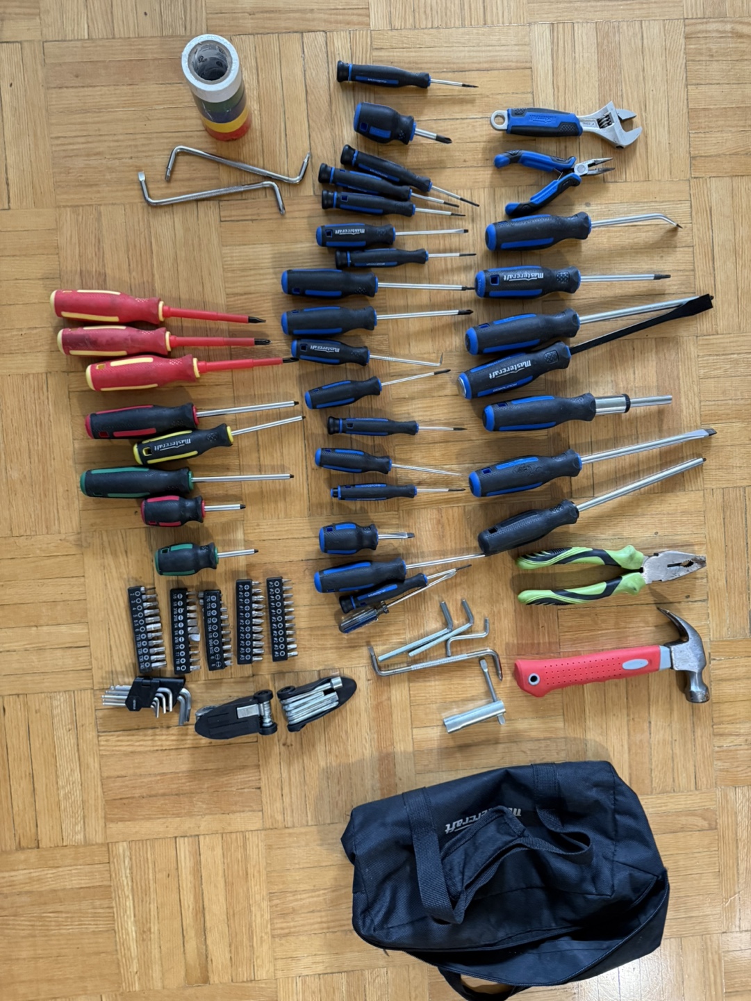 Tool set with various screwdrivers, a hammer, pliers, allen keys, and more. Comes with carrying bag.