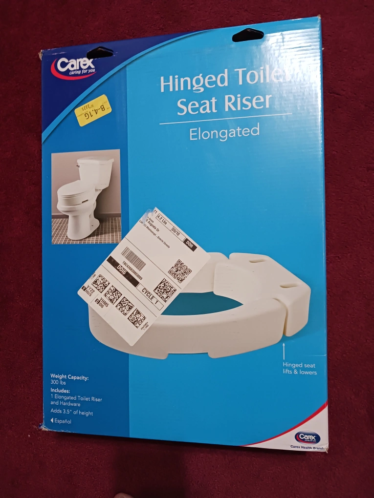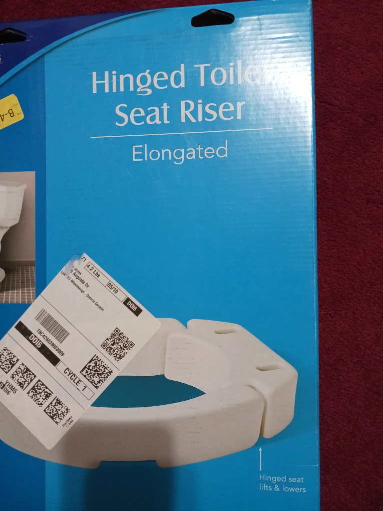 Elongated toilet seat riser. Adds 3.5 inches of height. Hinged seat lifts and lowers. Bought the wrong one and couldn't return. New in box. paid 45 plus tax.