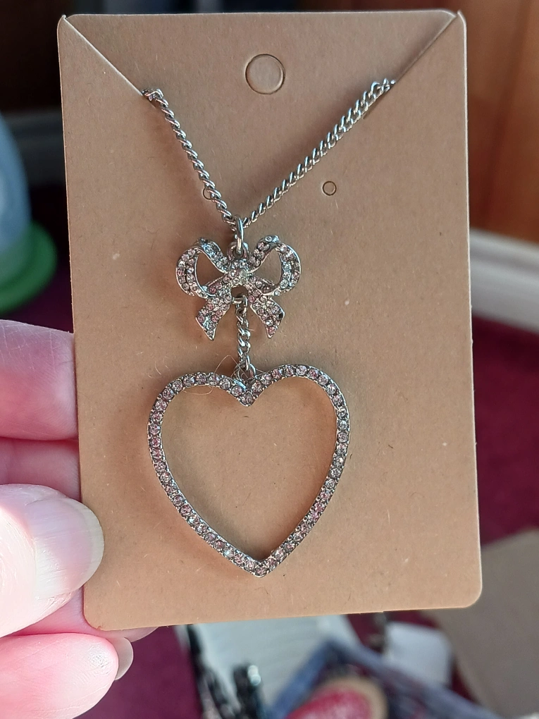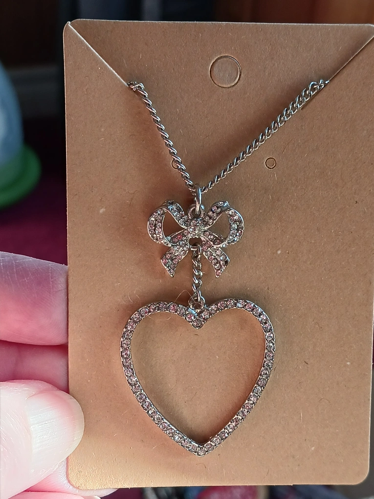 Silver plated necklace with a rhinestone heart and bow pendant.