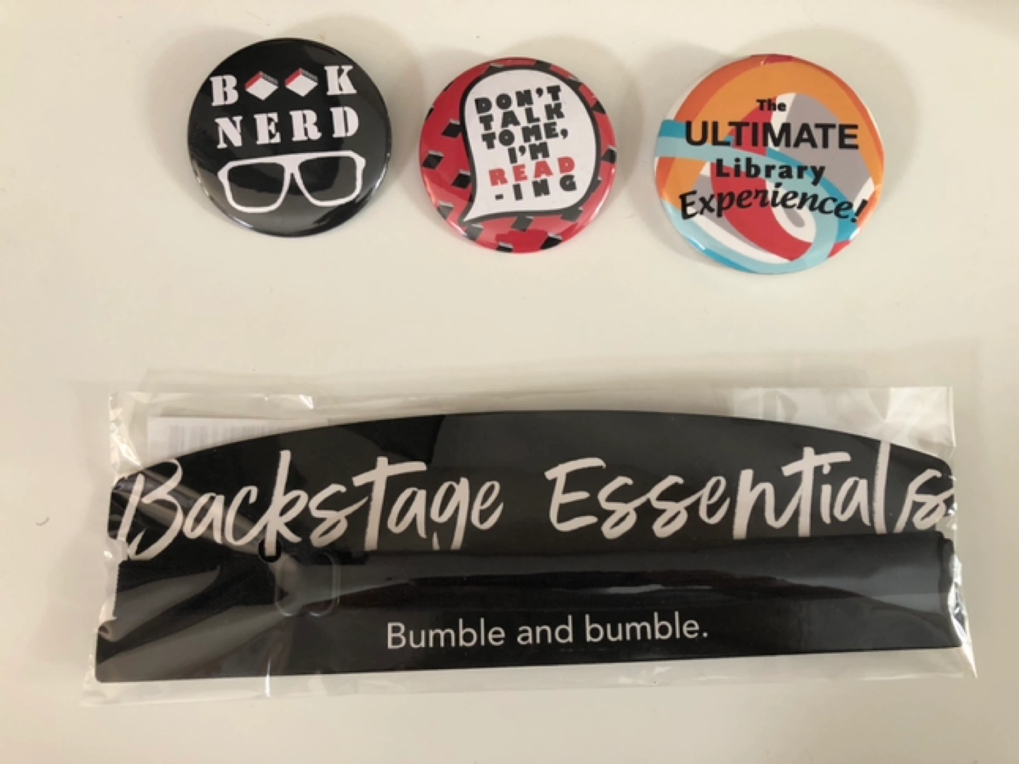 Three buttons with a book theme. One black and white button reads 'Book Nerd' with glasses, one red button reads 'Don't talk to me, I'm reading', and one multicoloured button reads 'The Ultimate Library Experience'. A black hair tie with white text reads 'Backstage Essentials' and 'Bumble and bumble'.