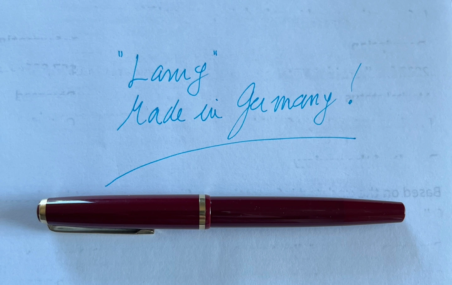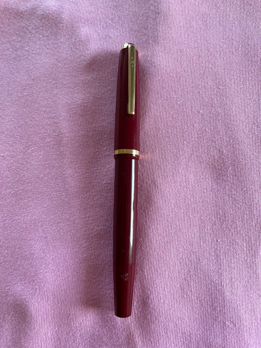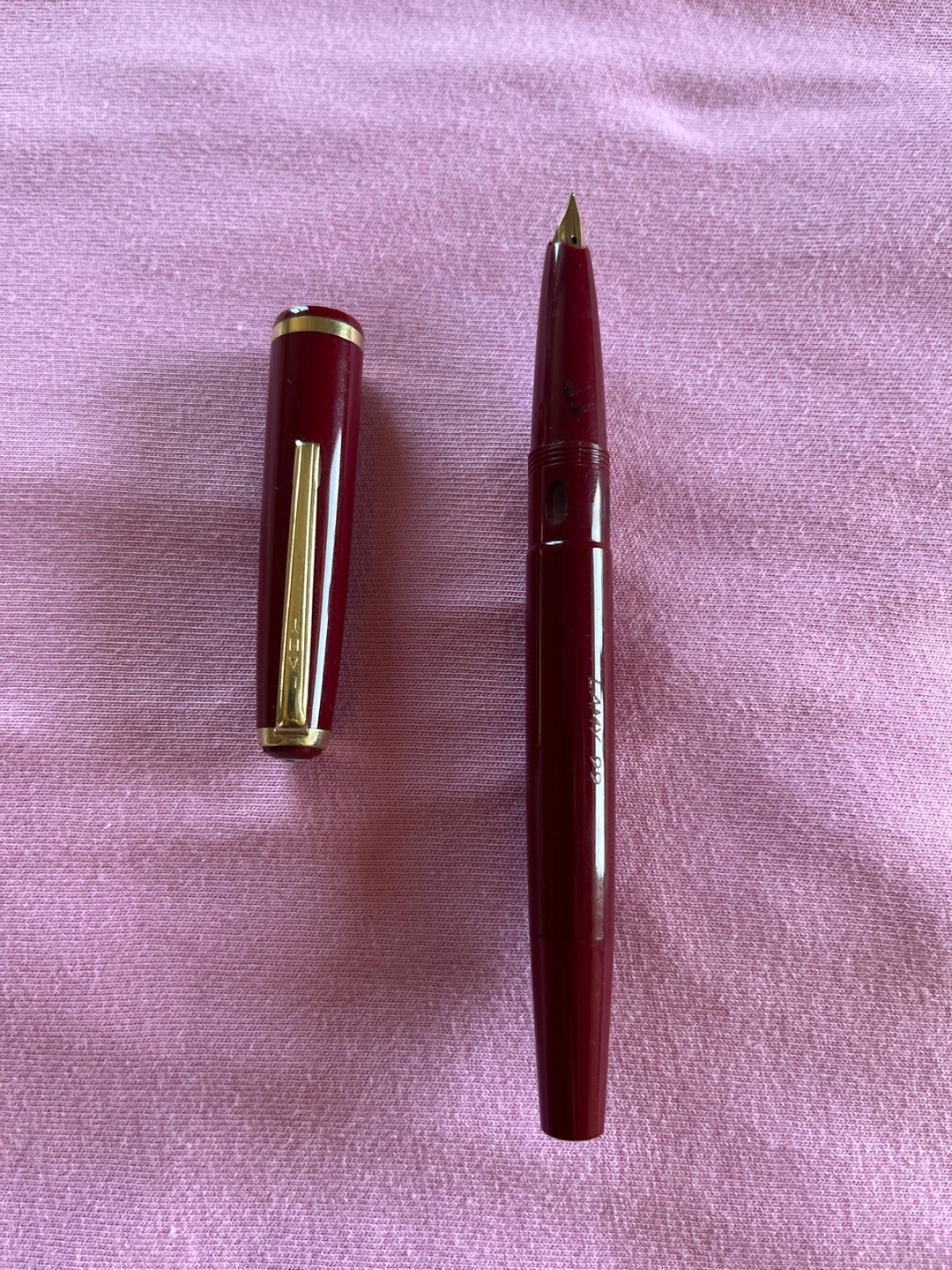 Burgundy fountain pen with gold accents. Made in Germany by Lamy circa 1975. Gold nib; vintage In perfect condition.