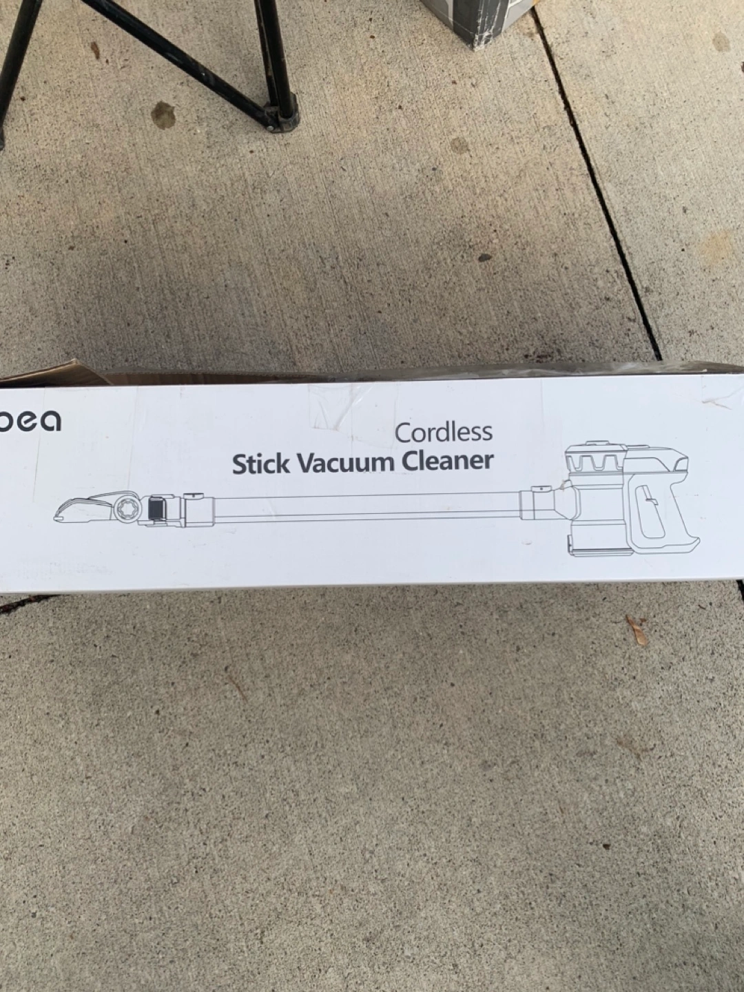 Cordless stick vacuum cleaner. Includes charging base, crevice tool, dusting brush, extension wand, and additional filter.