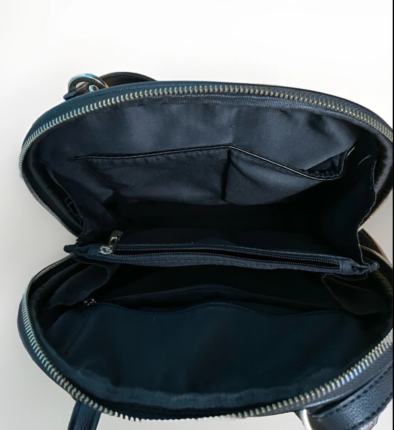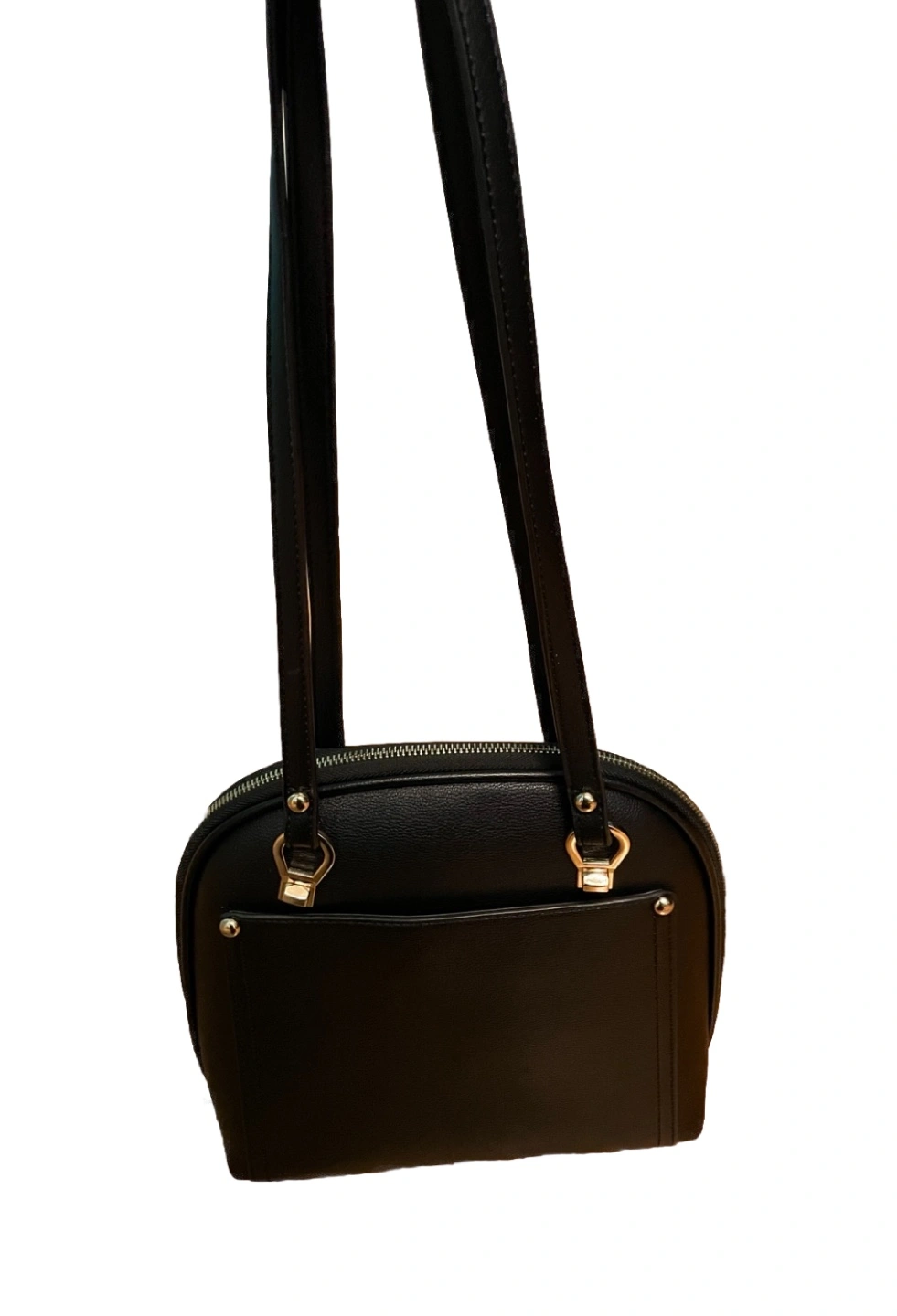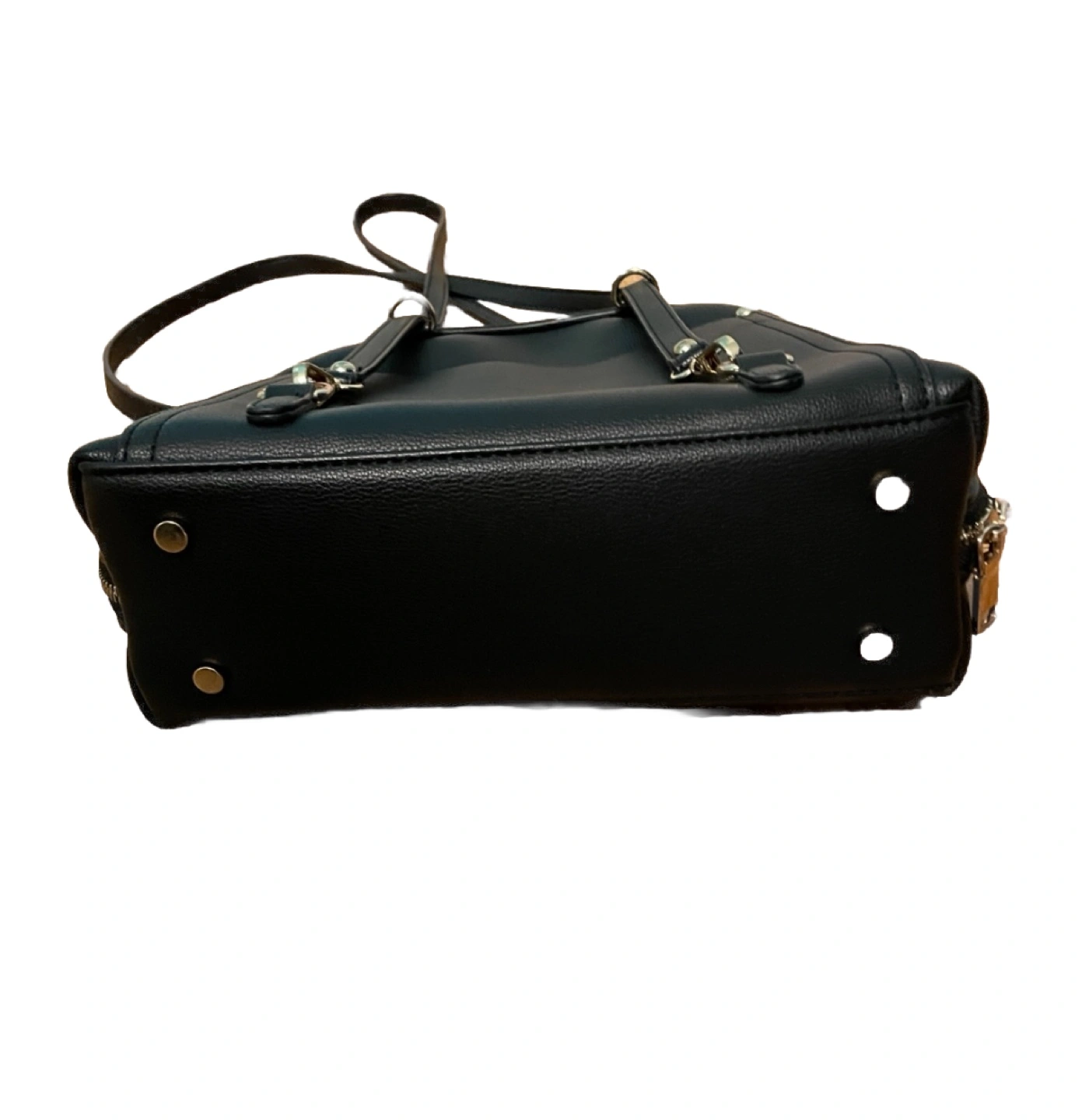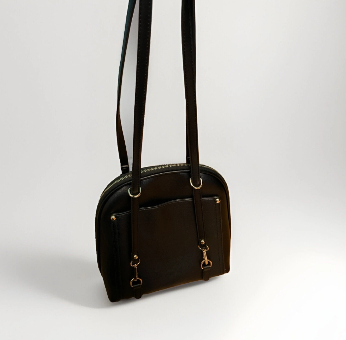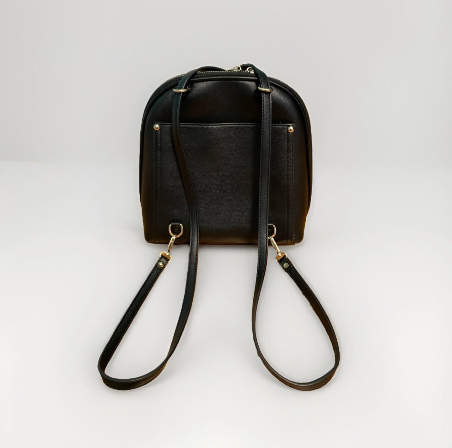 539Black faux leather backpack purse with gold hardware. Features a zippered top closure, interior pocket, and two exterior pockets. Adjustable straps. Can be worn as a backpack or shoulder bag. Two styles in one. Medium size bag. ๐ Moving Sale. Everything must go. Please check out my other listings to create bundles.