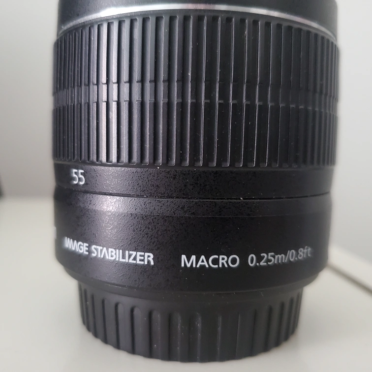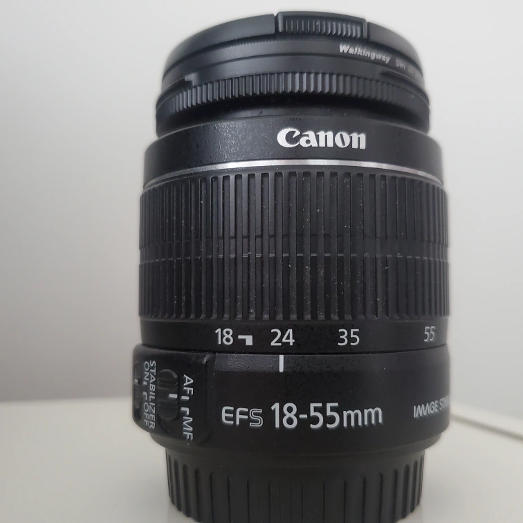 Canon EF-S 18-55mm f/3.5-5.6 IS II lens. Image stabilizer, macro mode, and autofocus/manual focus toggle. In excellent condition: No dents, scratches, or fungus. Comes with back and front caps, as well as lens filter.