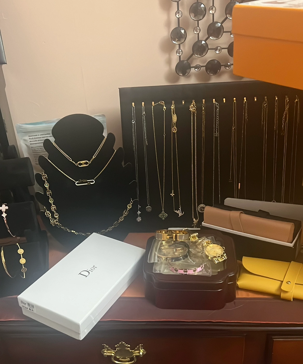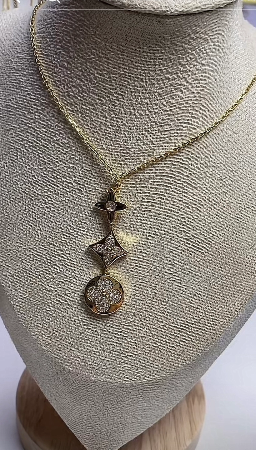 Set of designer jewelry including a necklace, earrings, and bracelet. All pieces are gold-tone and feature a crystal-embellished flower design.
