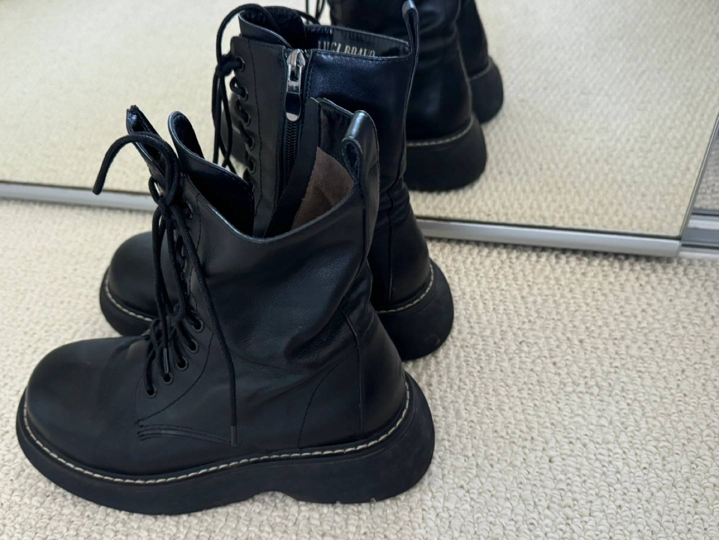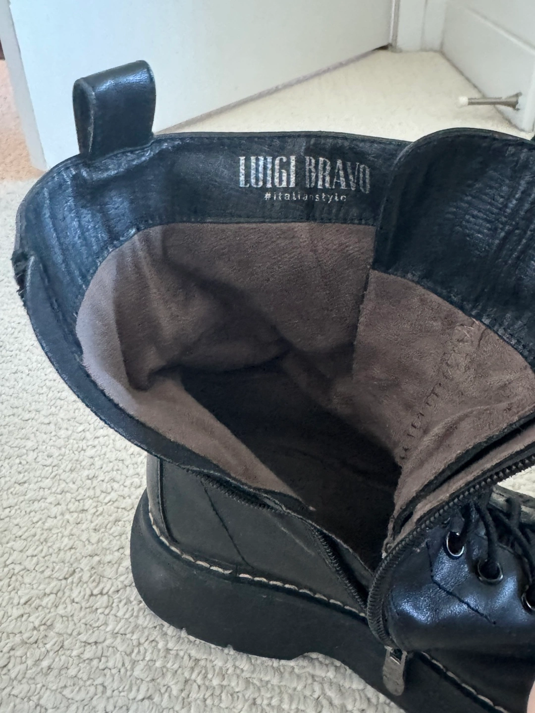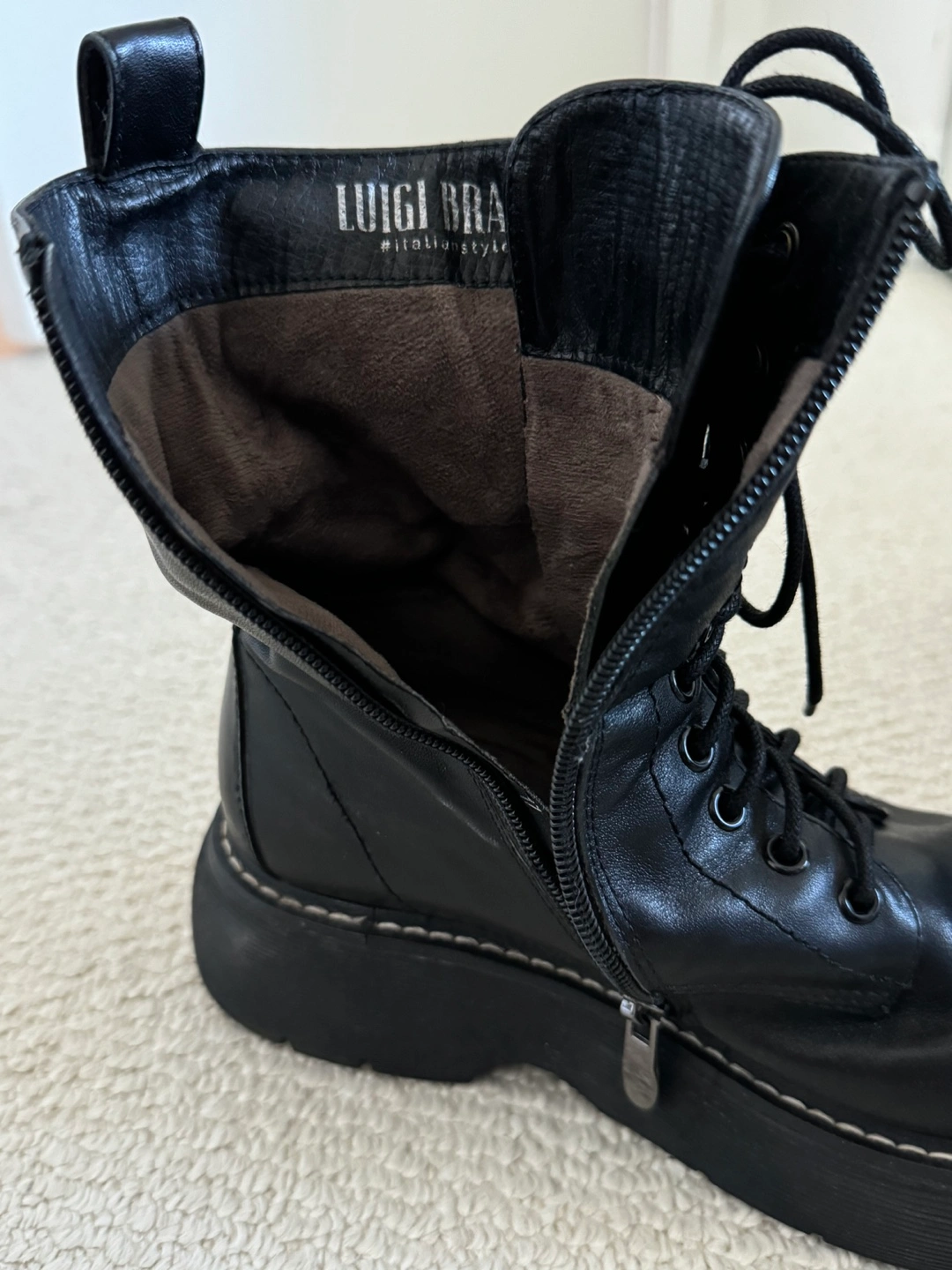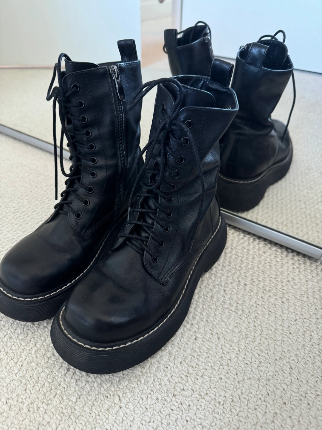 Black leather boots with laces and a side zipper. Zippers work well on both boots. Thick platform sole. Okay condition.