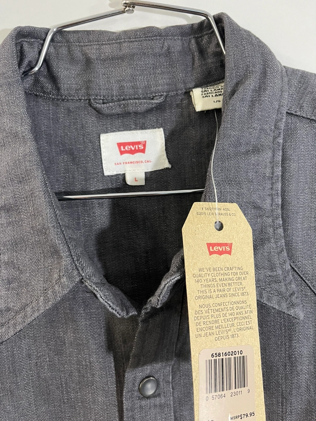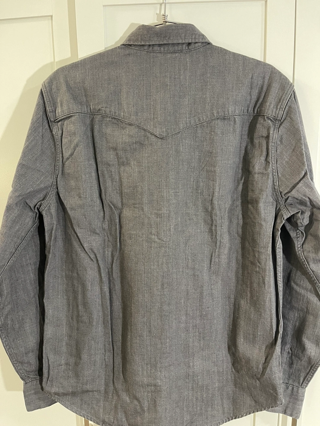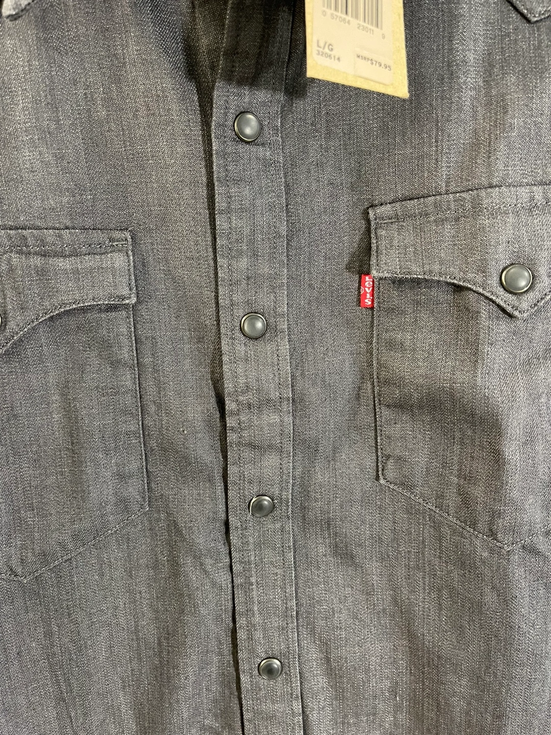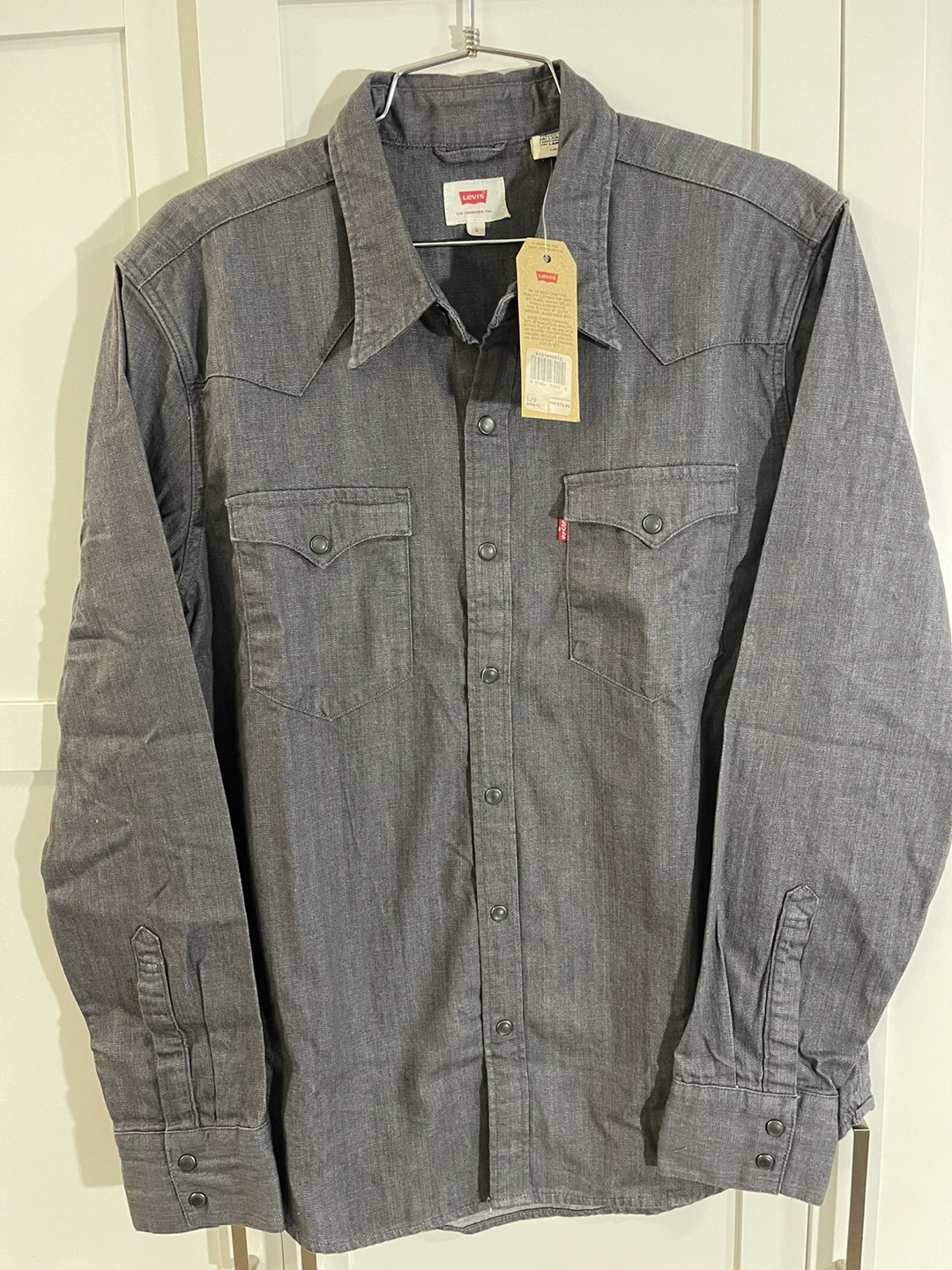 Grey denim long sleeve western style shirt with button up front. Features two chest pockets and a red Levi's tab on the right pocket.