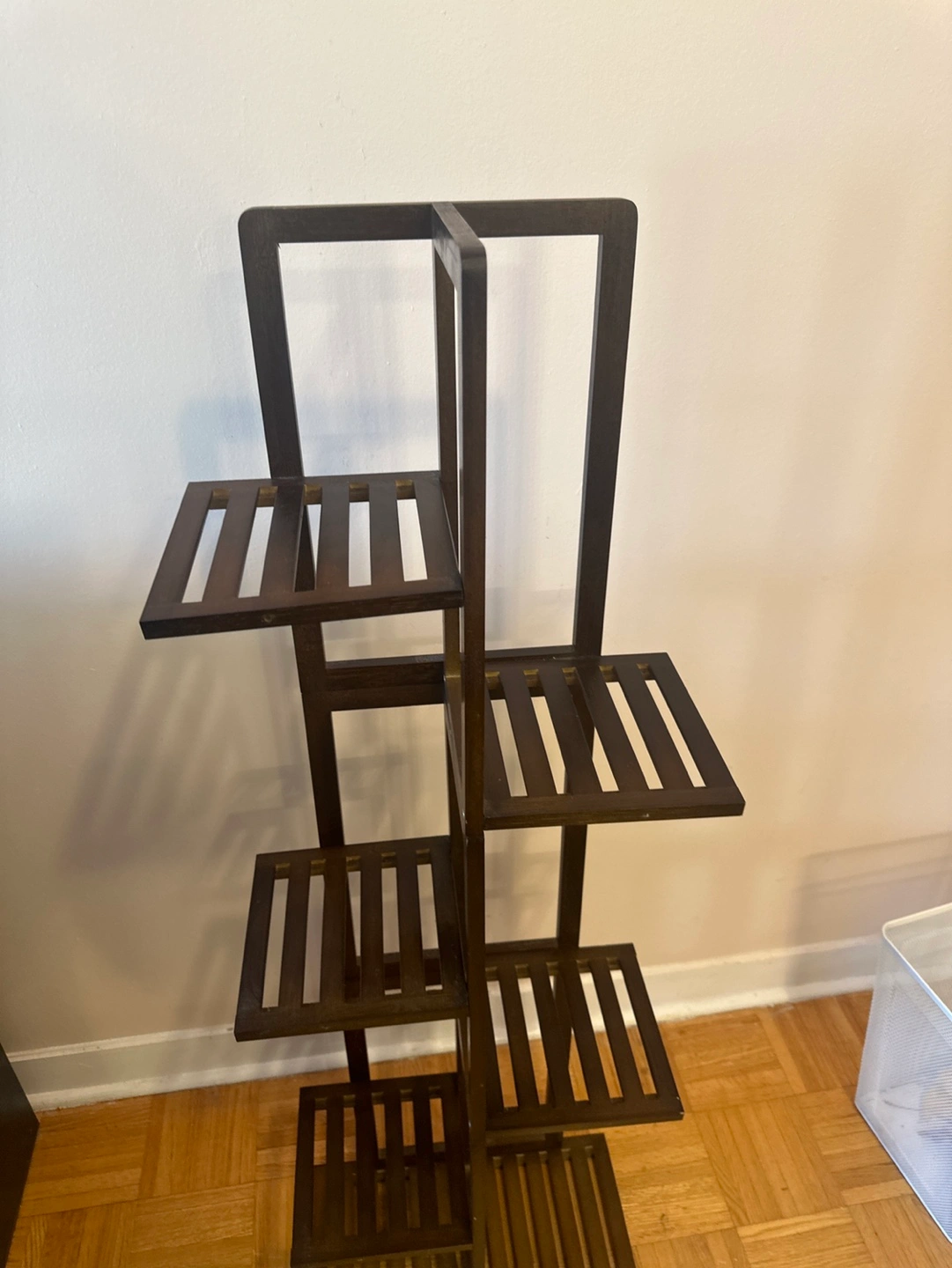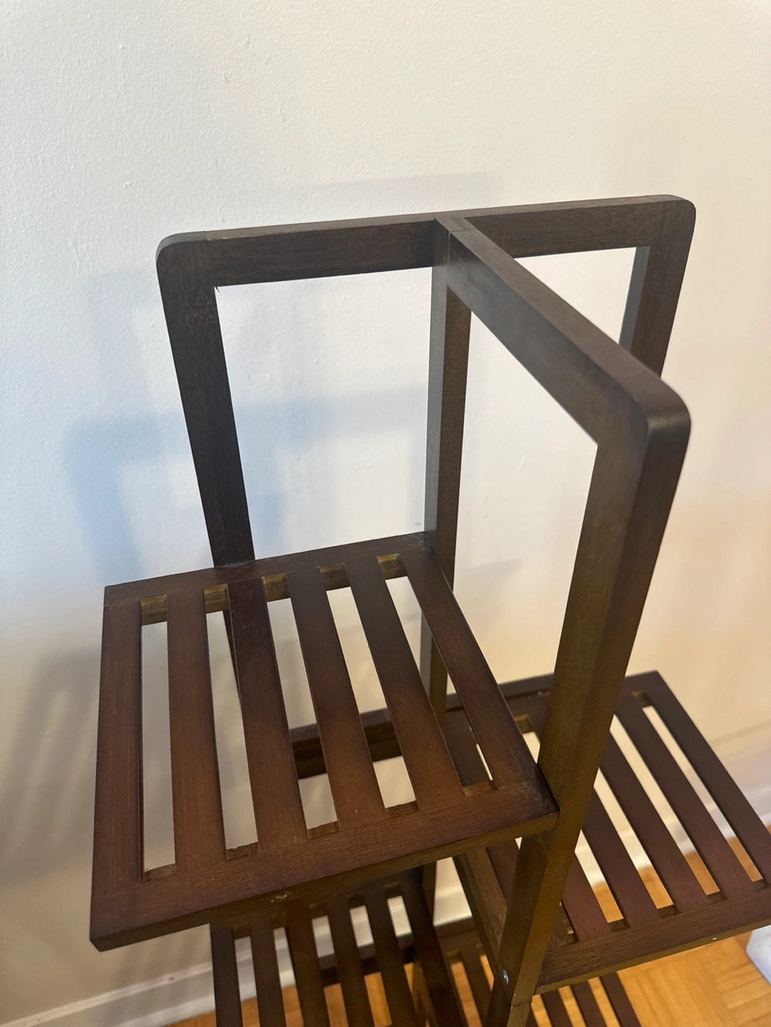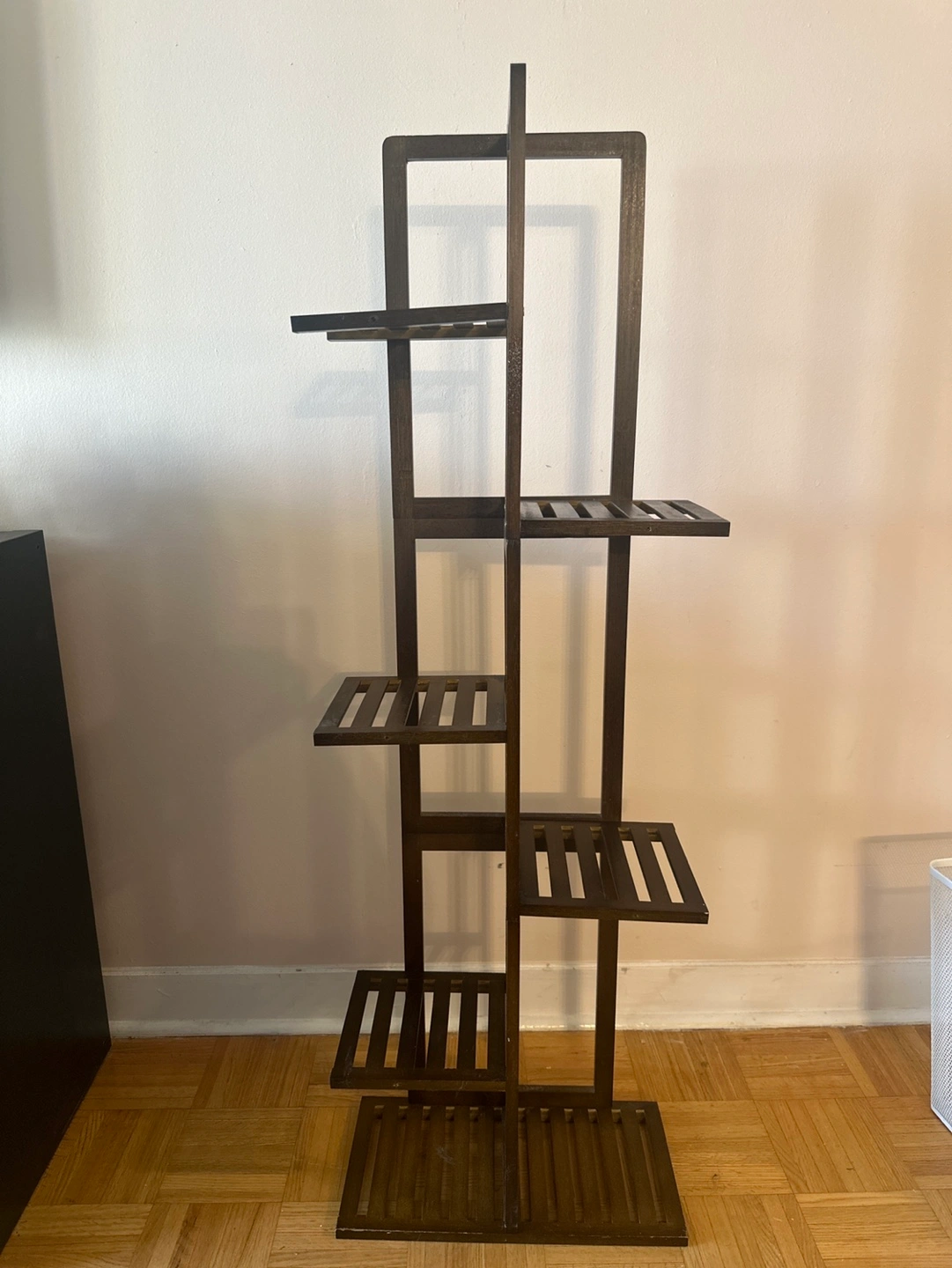 Five-tier plant stand made of bamboo. Dark brown stain.