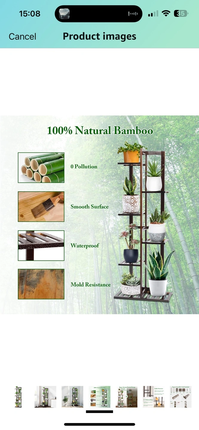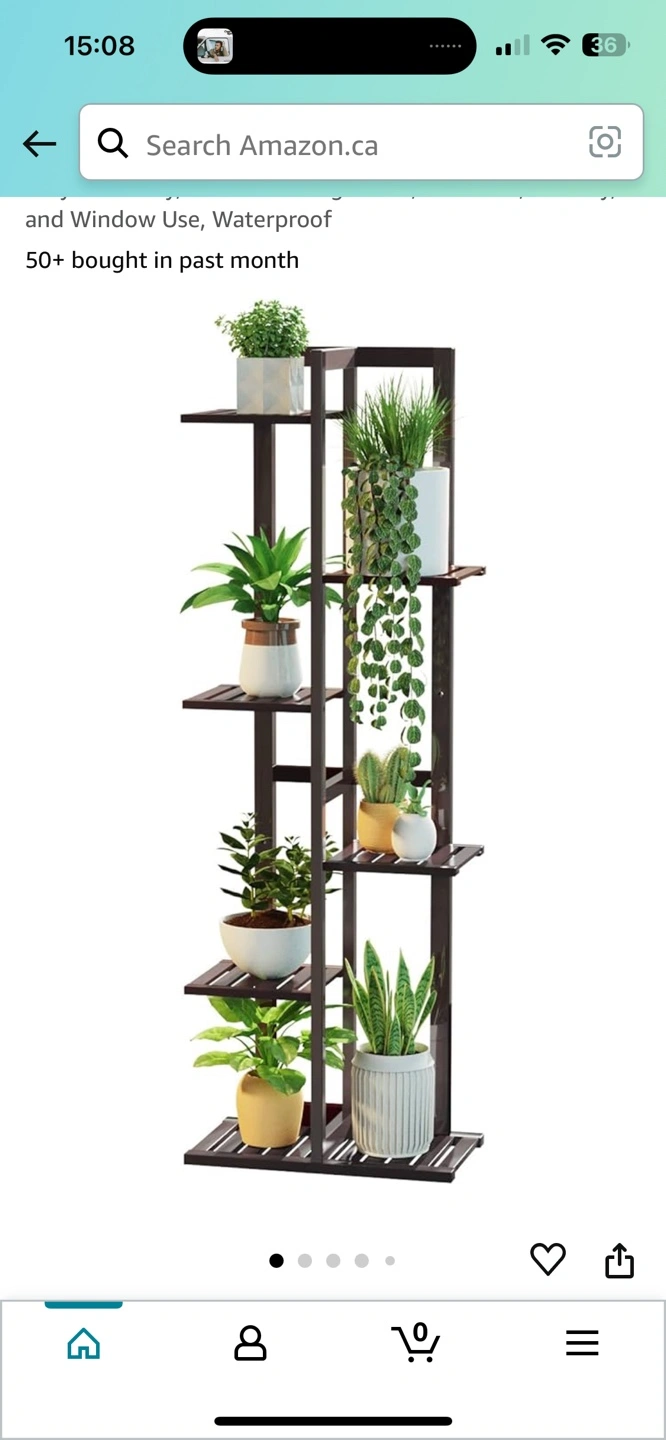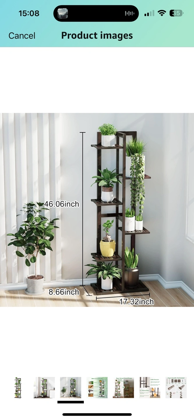 Five-tier plant stand made of bamboo. Dark brown stain.