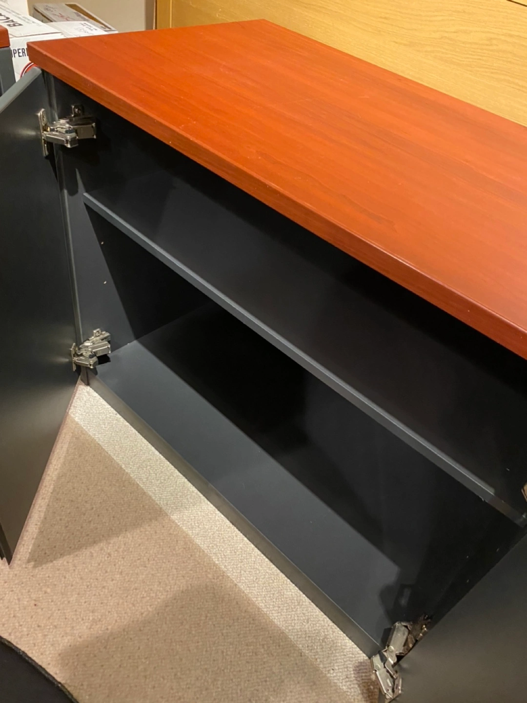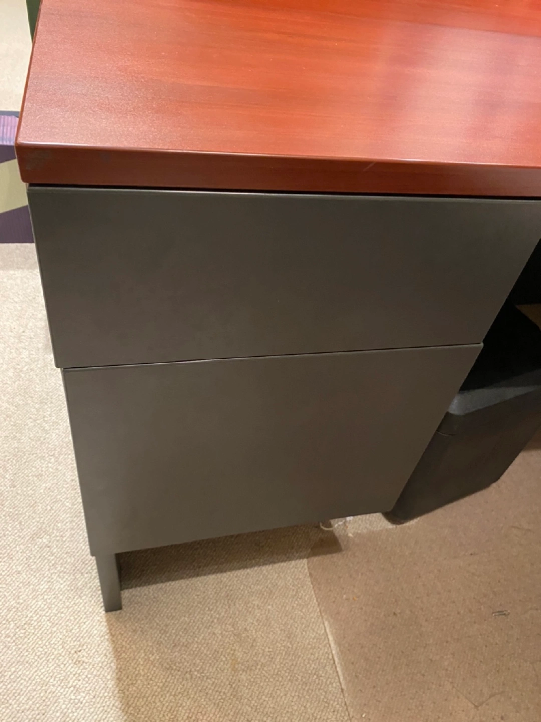 Office desk with a hutch and two door cabinet. The desk has a reddish wood top and a gray base. The matching hutch has a shelf. Commercial grade great for home or office